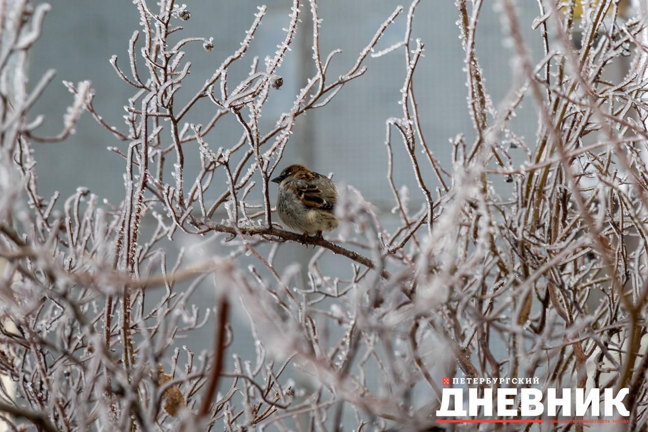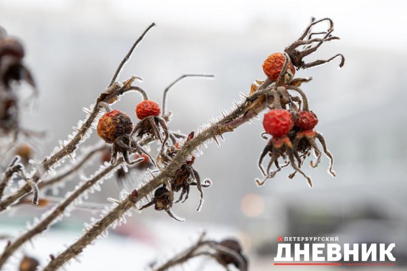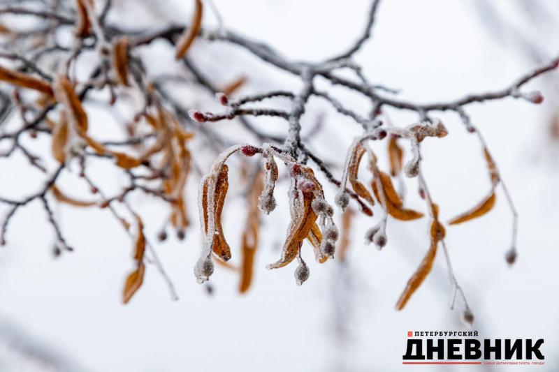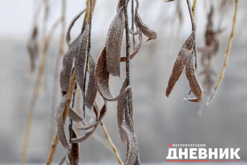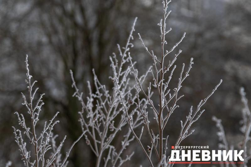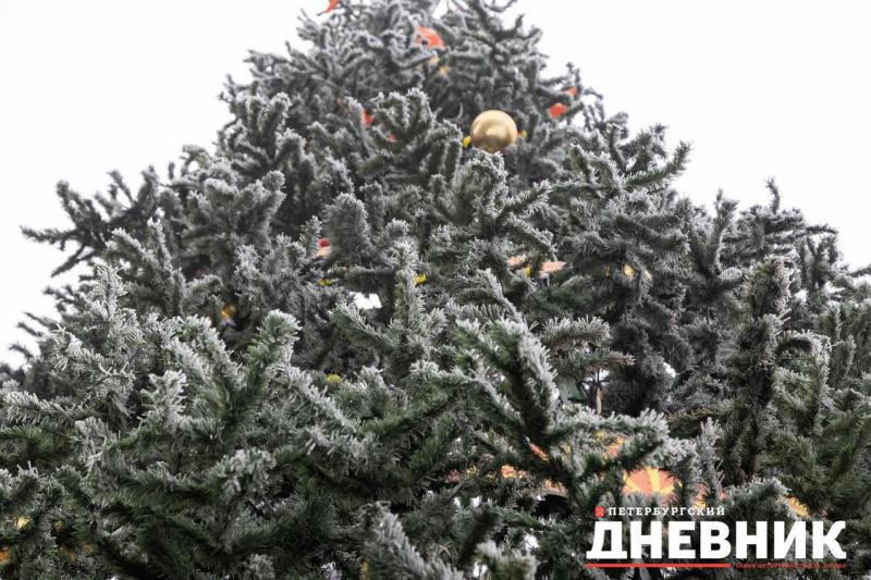 Туман сегодня практически весь день висит над Петербургом. Непростые погодные условия превратили деревья и кустарники в декорации к сказке «Снежная королева». Ветки растений, в том числе и новогодней елки, буквально сковало льдом. Зимнюю красоту запечатлел фотограф «Петербургского дневника».