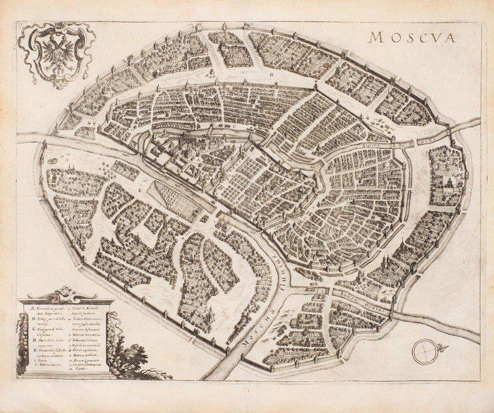 Еще один архитектурный памятник на бумаге – план Москвы 1638 года работы Маттеуса Мериана. Он примечателен тем, что является одной из первых попыток изобразить столицу «с высоты птичьего полета». Лот стартует с 100 000 рублей.