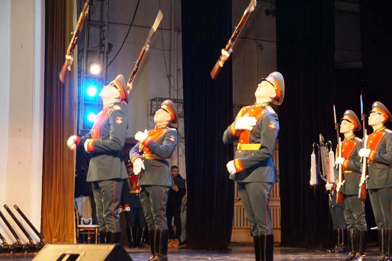 Торжественная часть началась с показательного выступления бойцов на сцене Дома офицеров. Как пояснил командир роты младший лейтенант Александр Лустенков, программа была специально адаптирована для представления в закрытом помещении на ограниченном пространстве сцены.