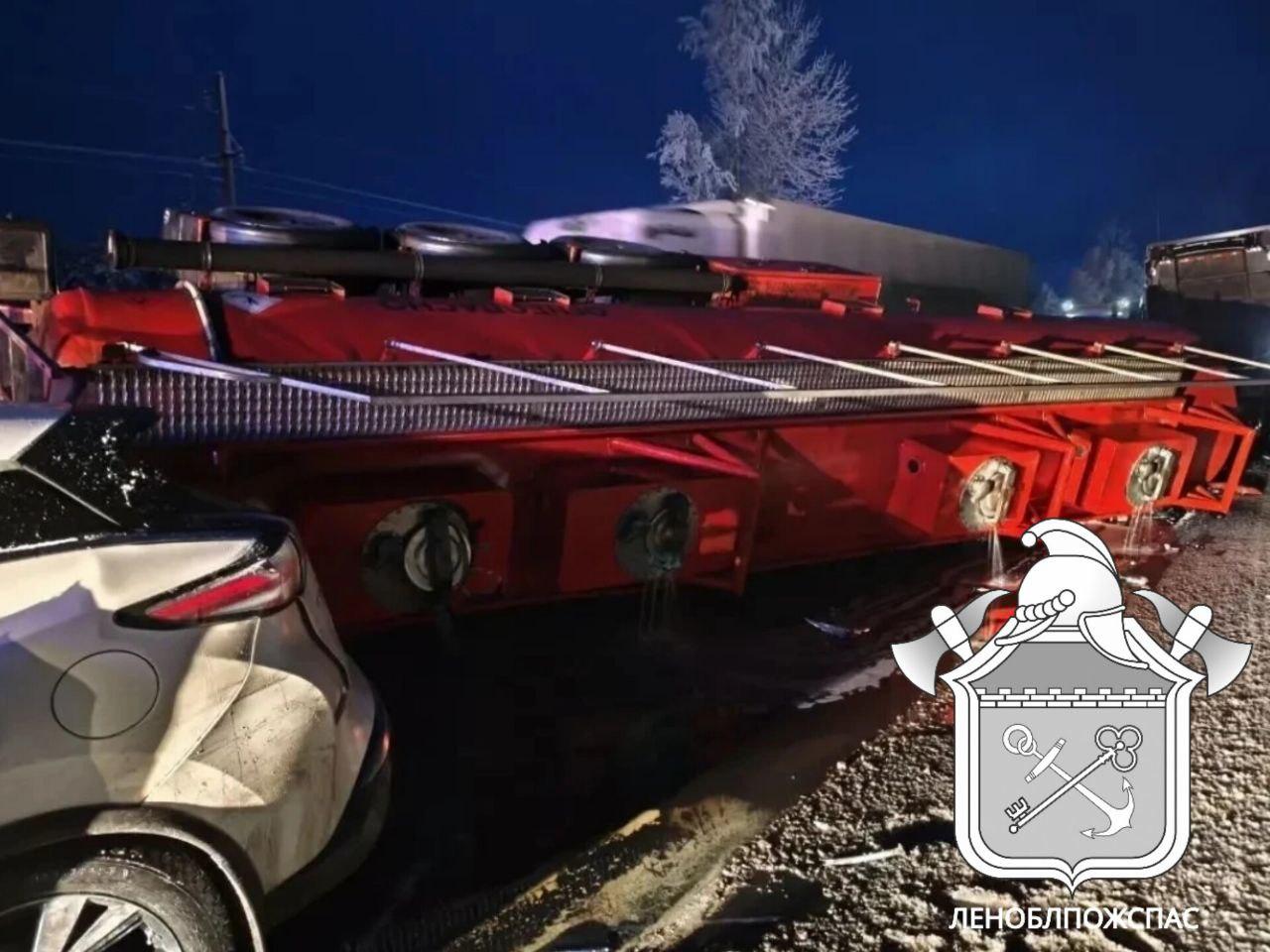 В настоящее время решается вопрос о стабилизации опрокинувшейся цистерны. Это необходимо сделать до прибытия специализированного эвакуатора, чтобы избежать новых повреждений и утечек при подъеме.