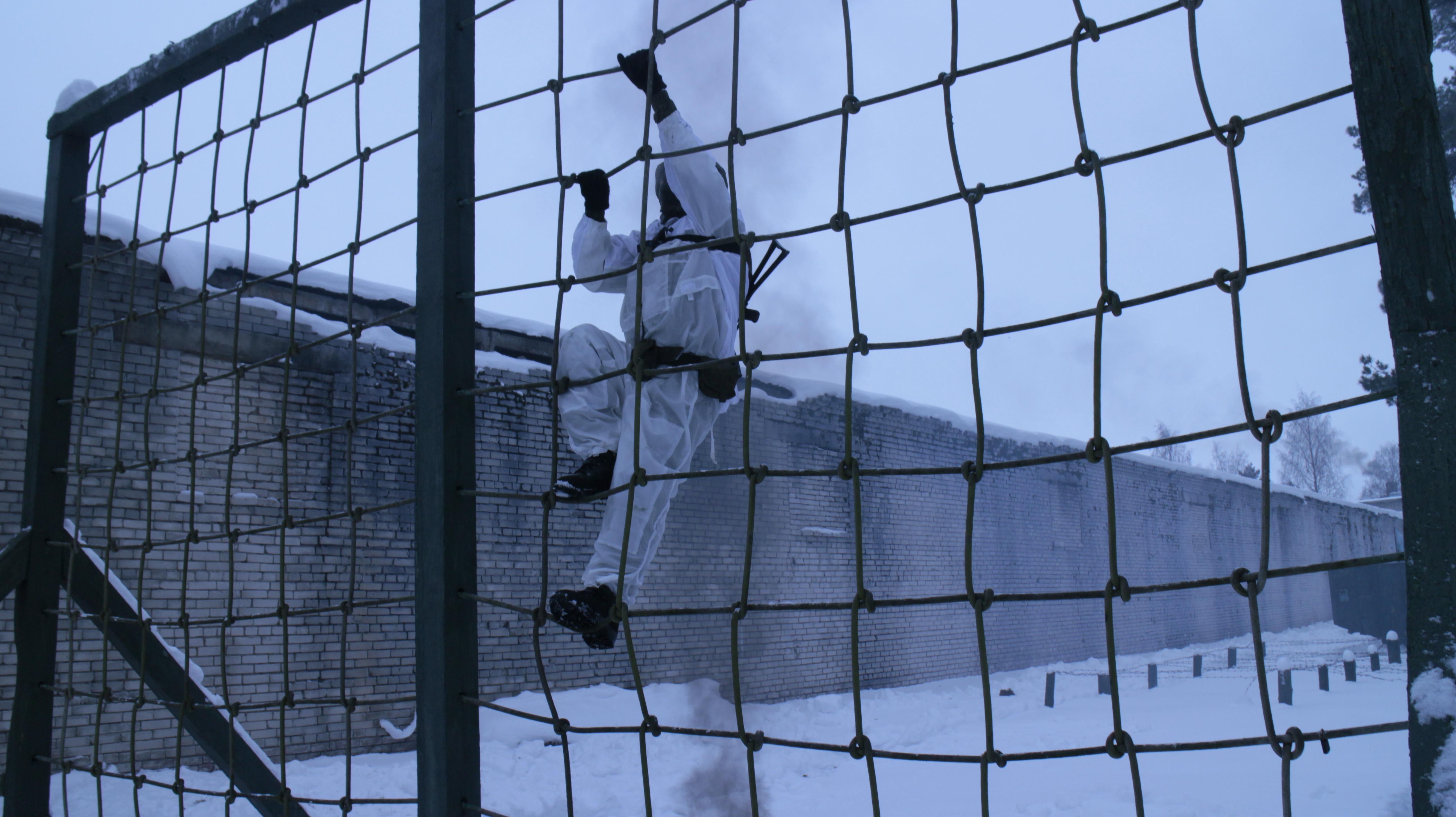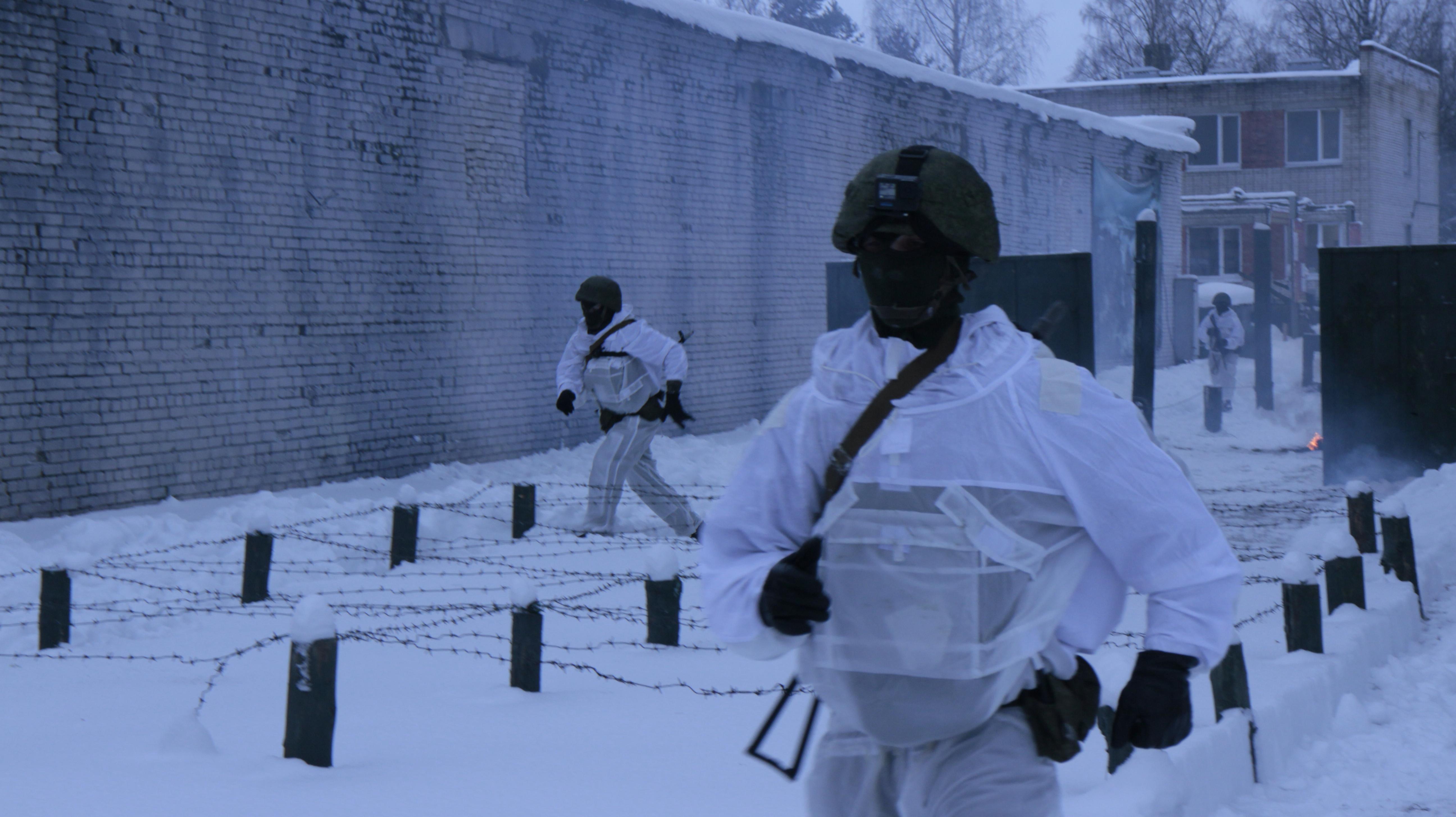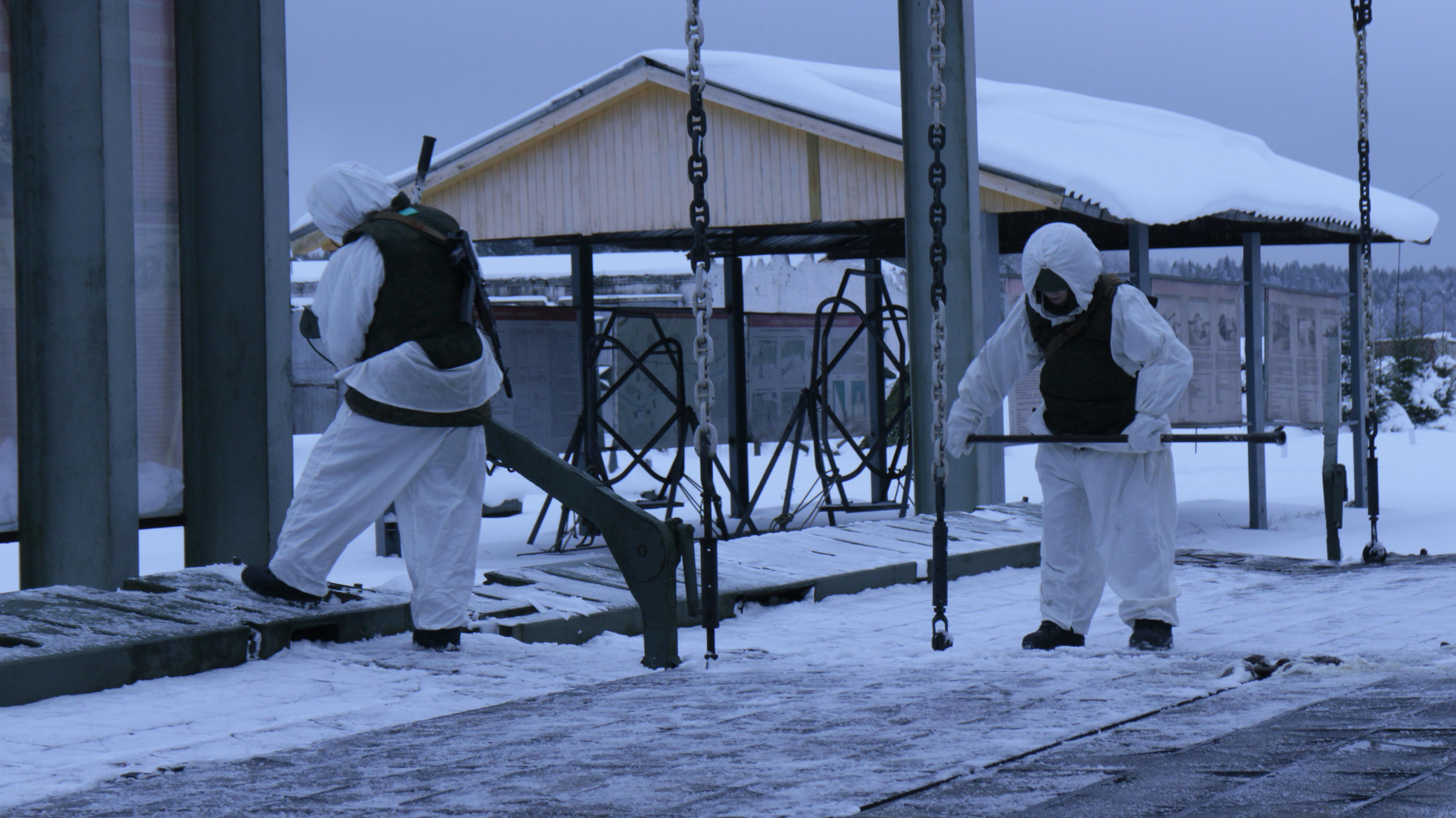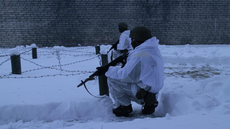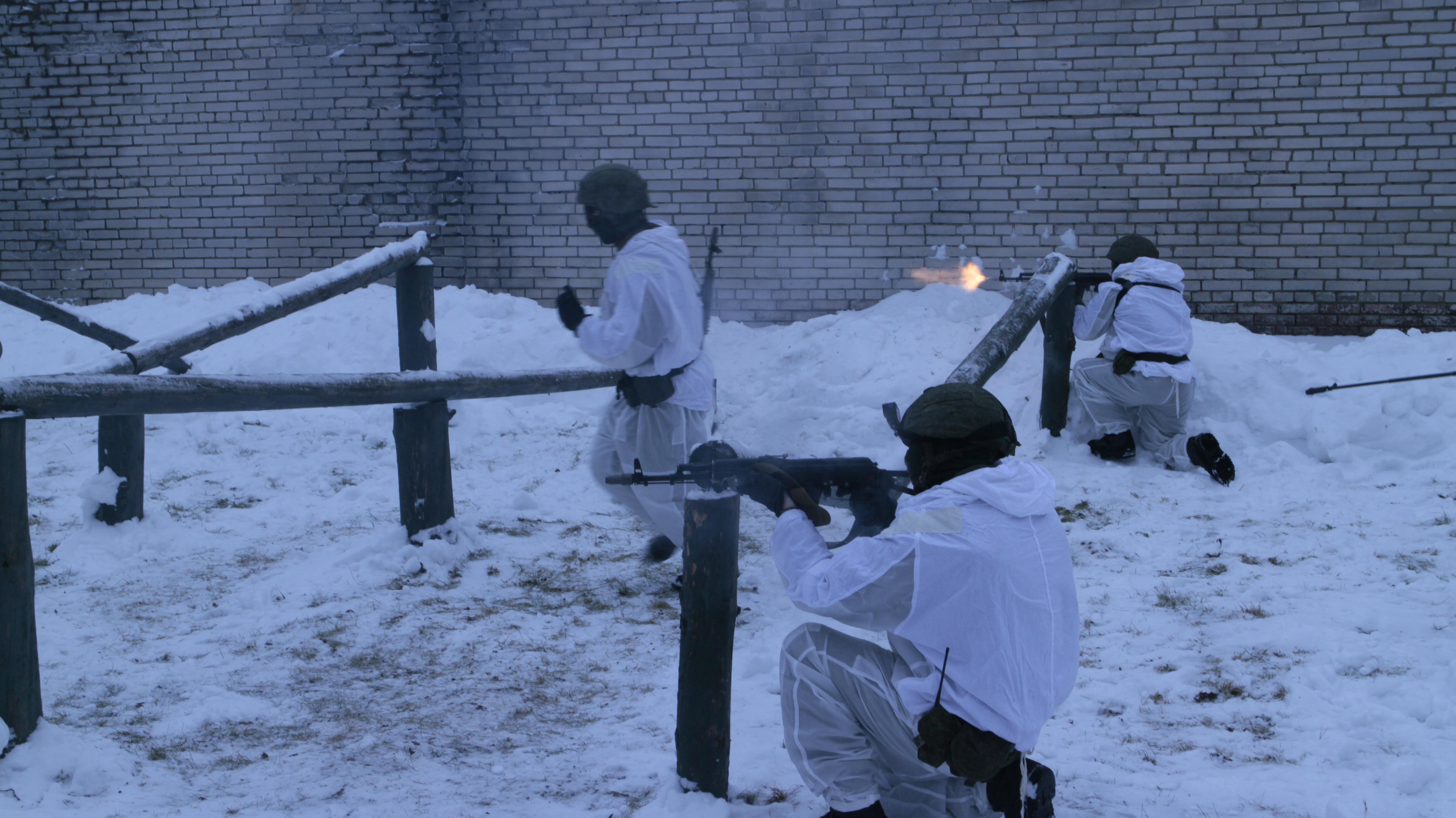 Дым от горящих покрышек стелется вдоль земли. Военнослужащие в белых маскировочных халатах отрабатывают приемы передвижения под огнем противника, преодолевая при этом различные препятствия. На маршруте воинов ожидает множество разных сюрпризов: взрывпакеты, дымовые шашки, огневые ловушки. Но военным инженерам всё нипочем, они действуют не хуже настоящих штурмовиков