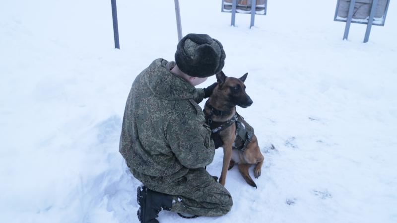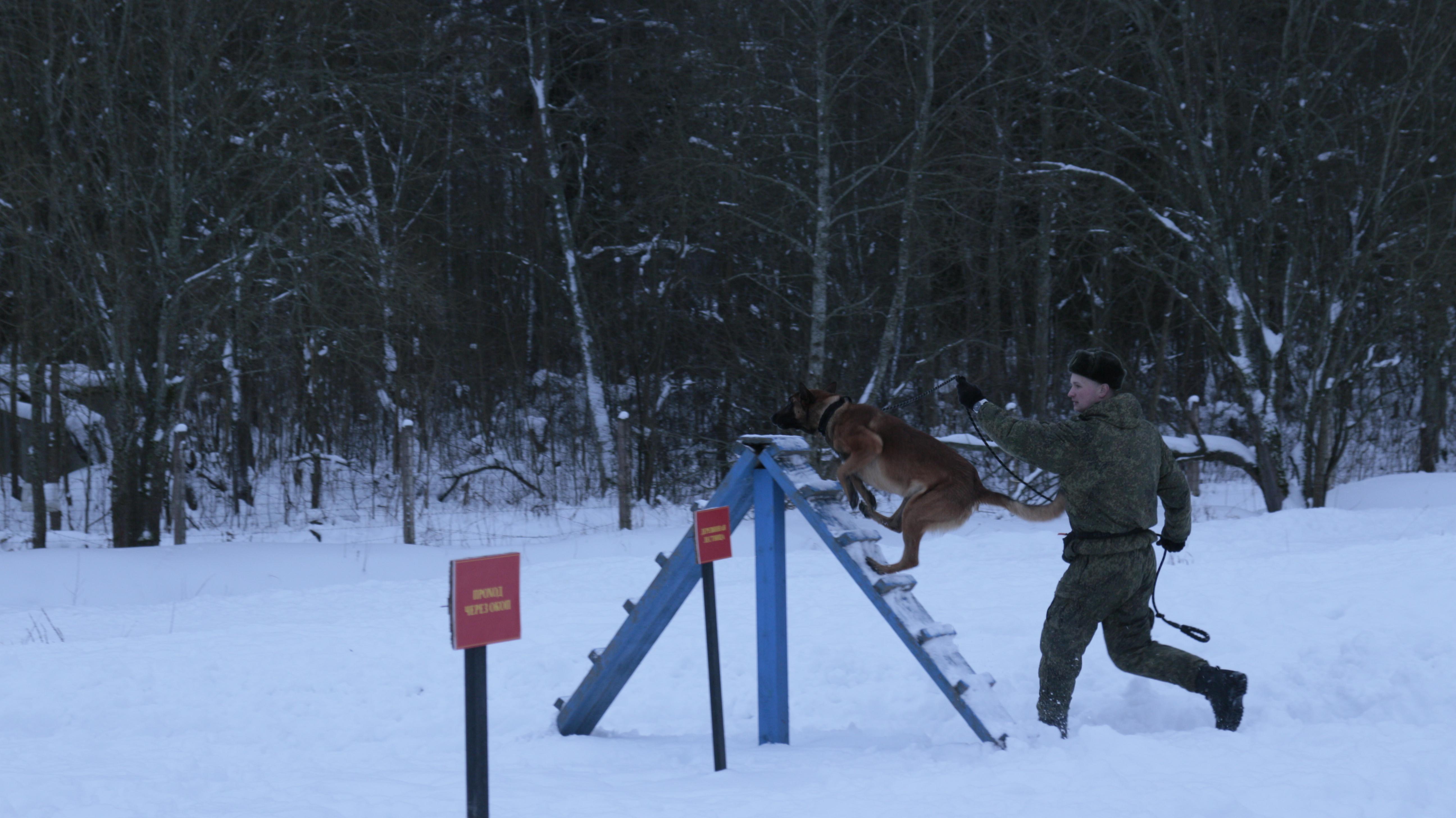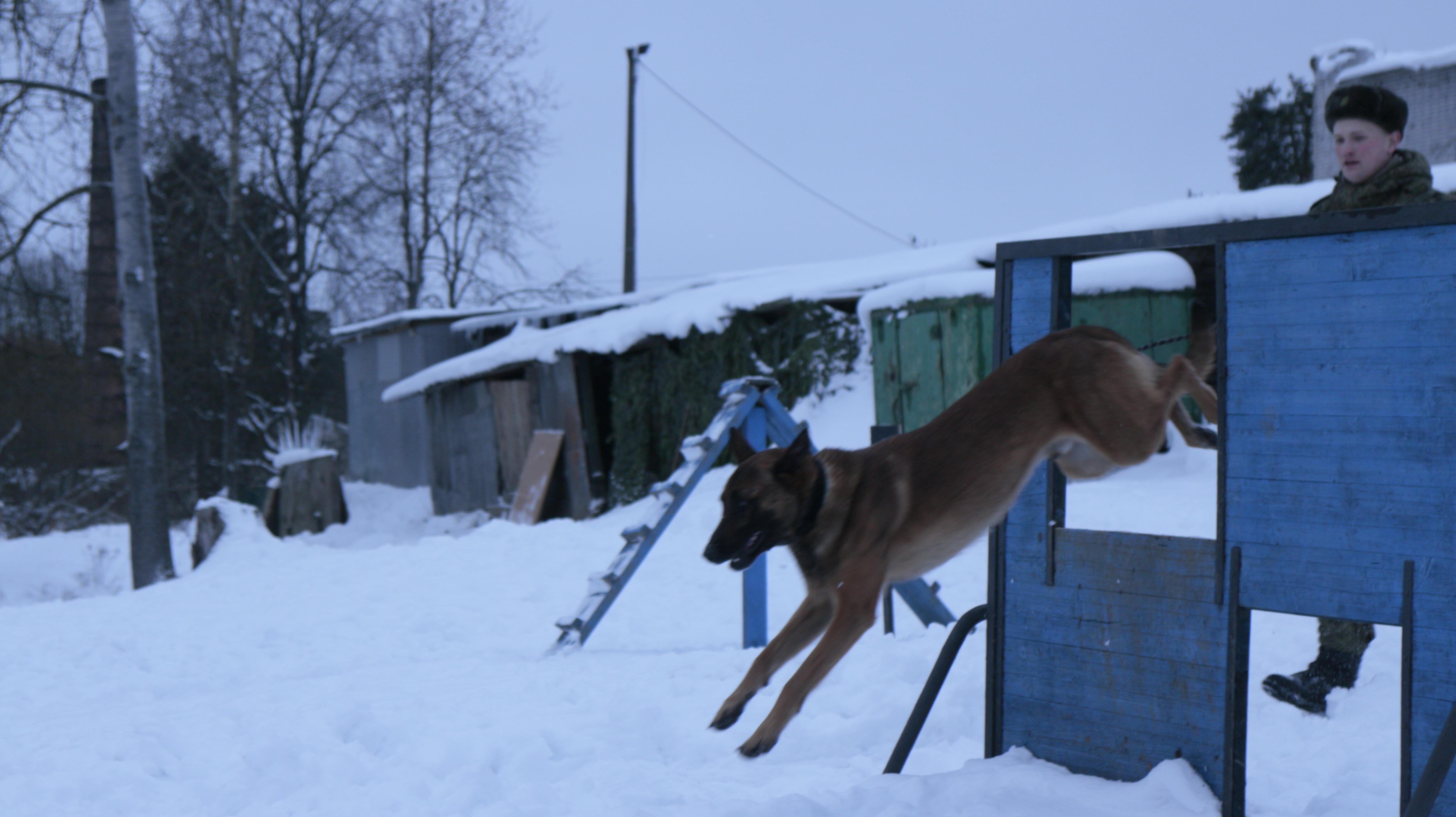 Выдвигаемся к учебной точке, занятия на которой завершат сегодняшнюю тренировку. Уже на подходе слышится собачий лай. Это нас приветствует бельгийская овчарка по кличке Нэвер. Самое удивительное, что Нэвер тоже считается военным инженером, у нее даже есть должность, прописанная в штате подразделения, – минно-розыскная собака. И на занятиях, как и остальные военнослужащие, она тоже преодолевает полосу препятствий. Нэвер перепрыгивает через стены, ныряет в различные проемы, проползает по узким подземным траншеям. В конце полосы овчарку ждет награда – ее вожатый достает из сумки, подвешенной на поясе, что-то вкусное и кладет ей в пасть. Нэвер довольно облизывается, просит добавку.