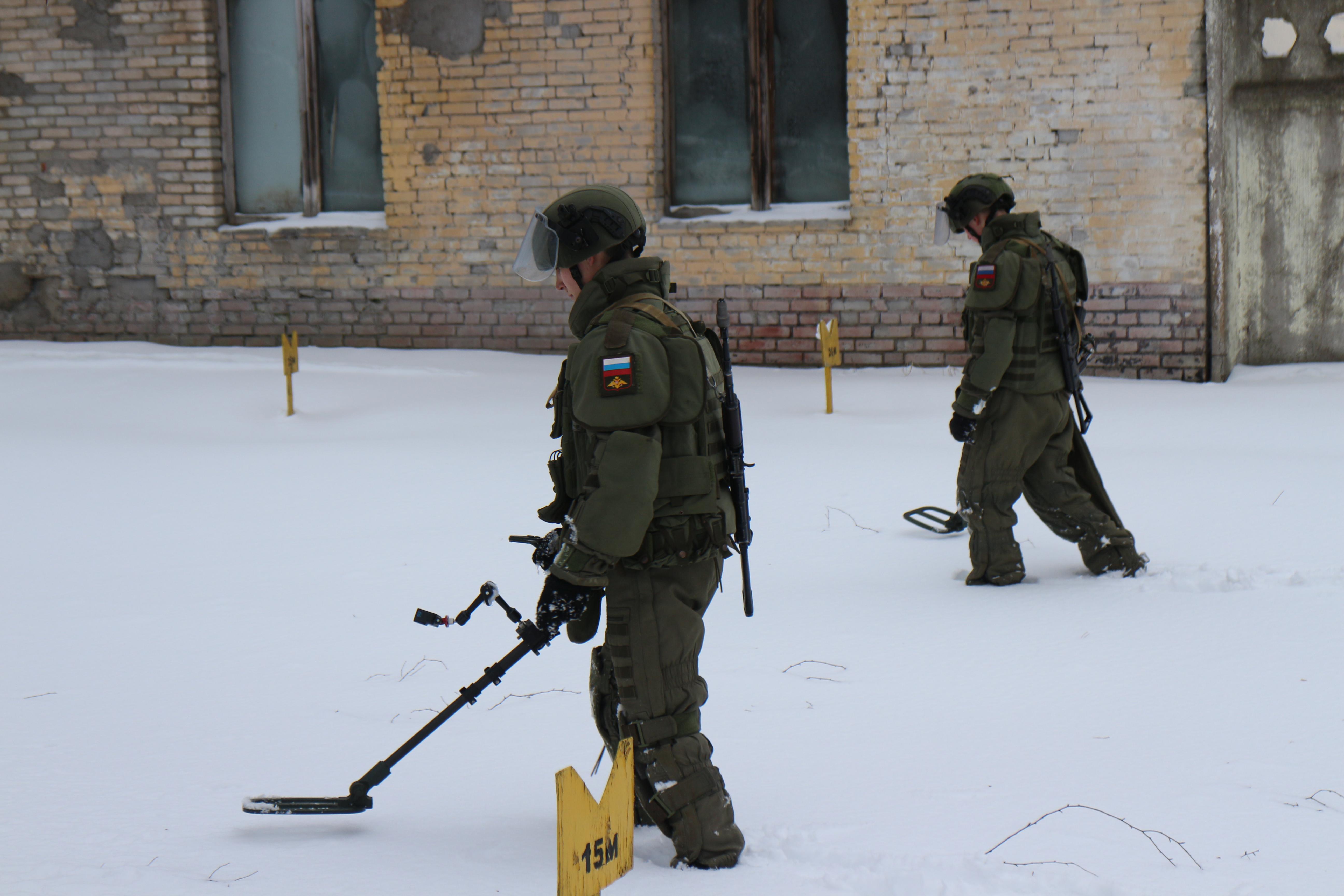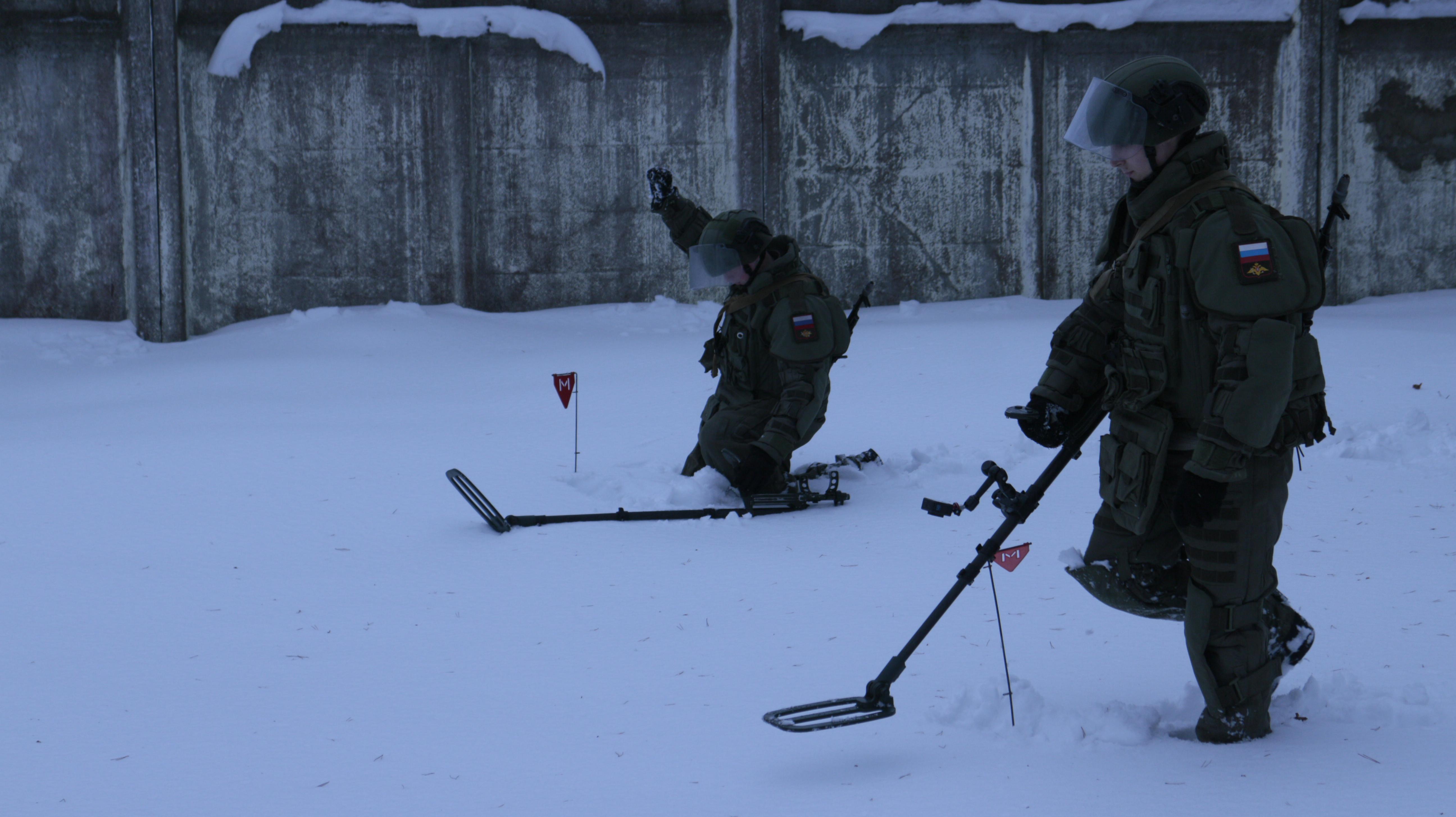 Военнослужащие, облаченные в специальные защитные костюмы, медленно идут по заснеженной дороге, внимательно проверяя землю вокруг с помощью миноискателя. Вот один из них приседает на колено и поднимает руку, сигнализируя об обнаруженном взрывном устройстве. Помечает опасную находку специальным флажком, производит доклад.