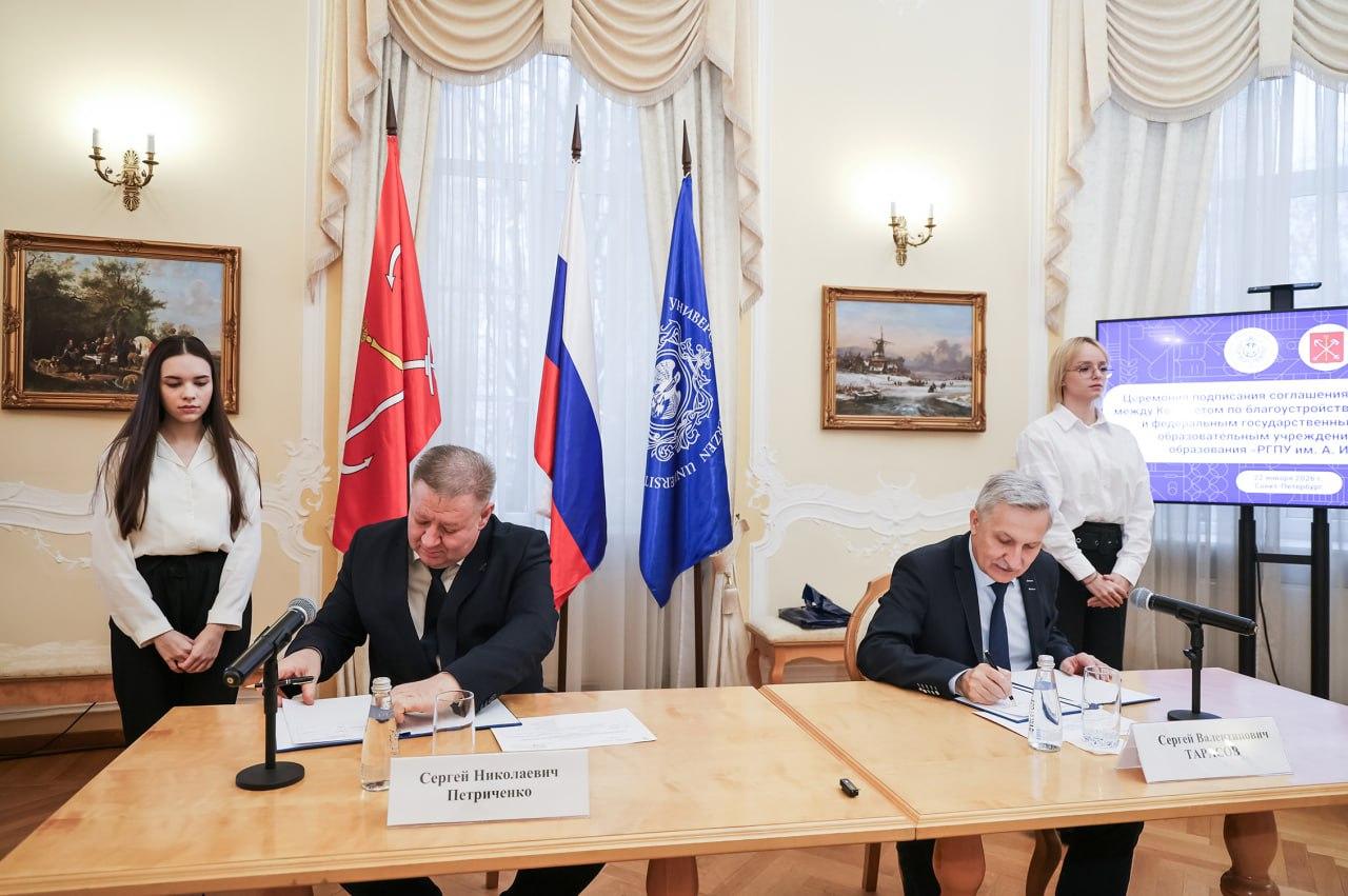 Комитет по благоустройству Санкт-Петербурга и РГПУ им. А.И. Герцена подписали соглашение о стратегическом партнерстве. Документ, скрепленный подписями председателя комитета Сергея Петриченко и ректора университета Сергея Тарасова, открывает новые возможности для совместной работы.