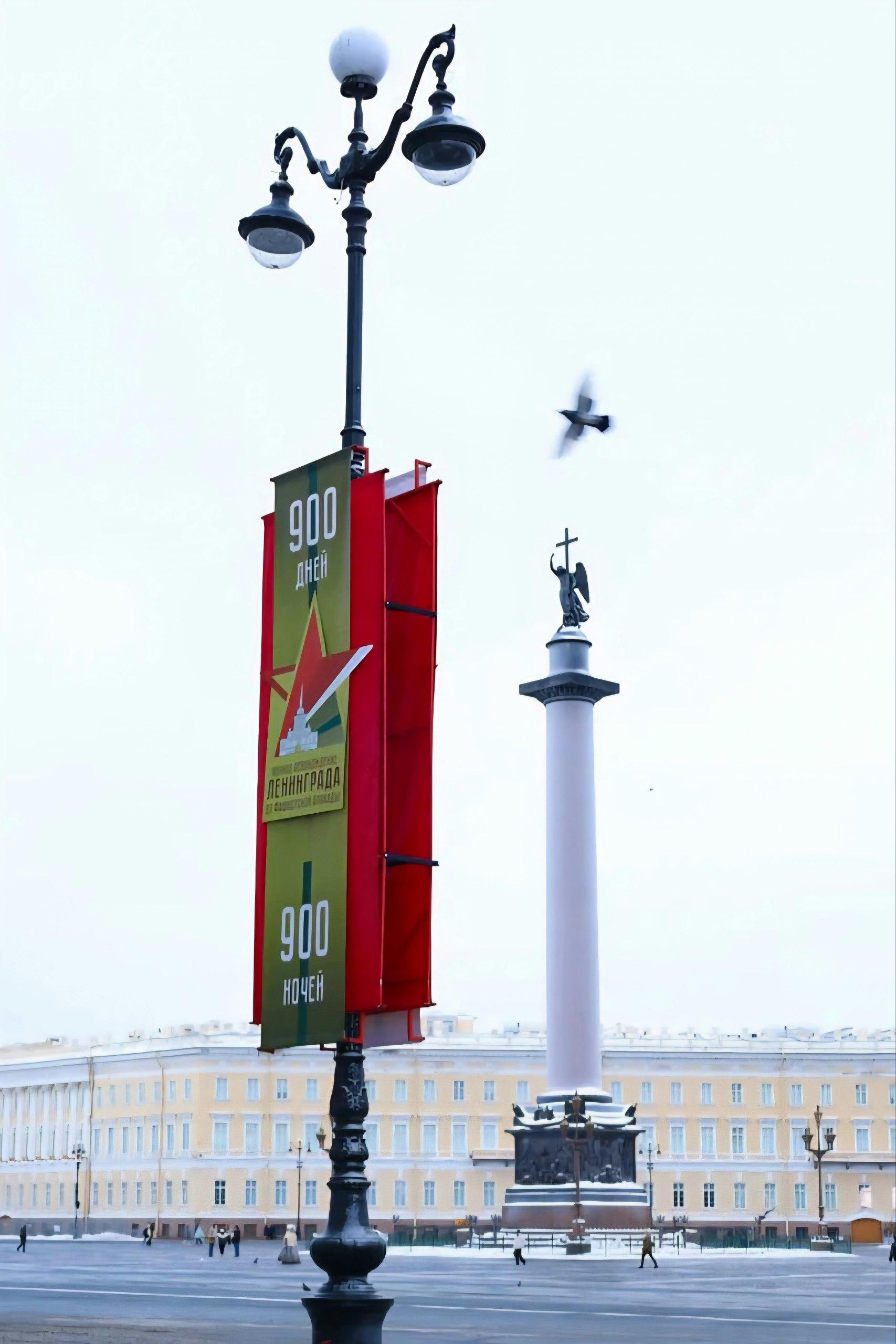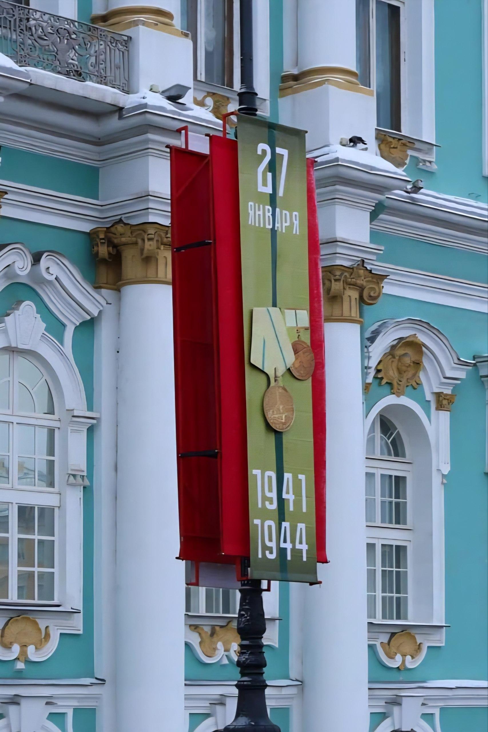 В честь 82-летия полного освобождения Ленинграда от фашистской блокады на центральных улицах и площадях разместили памятные элементы, посвященные подвигу защитников и жителей осажденного города.