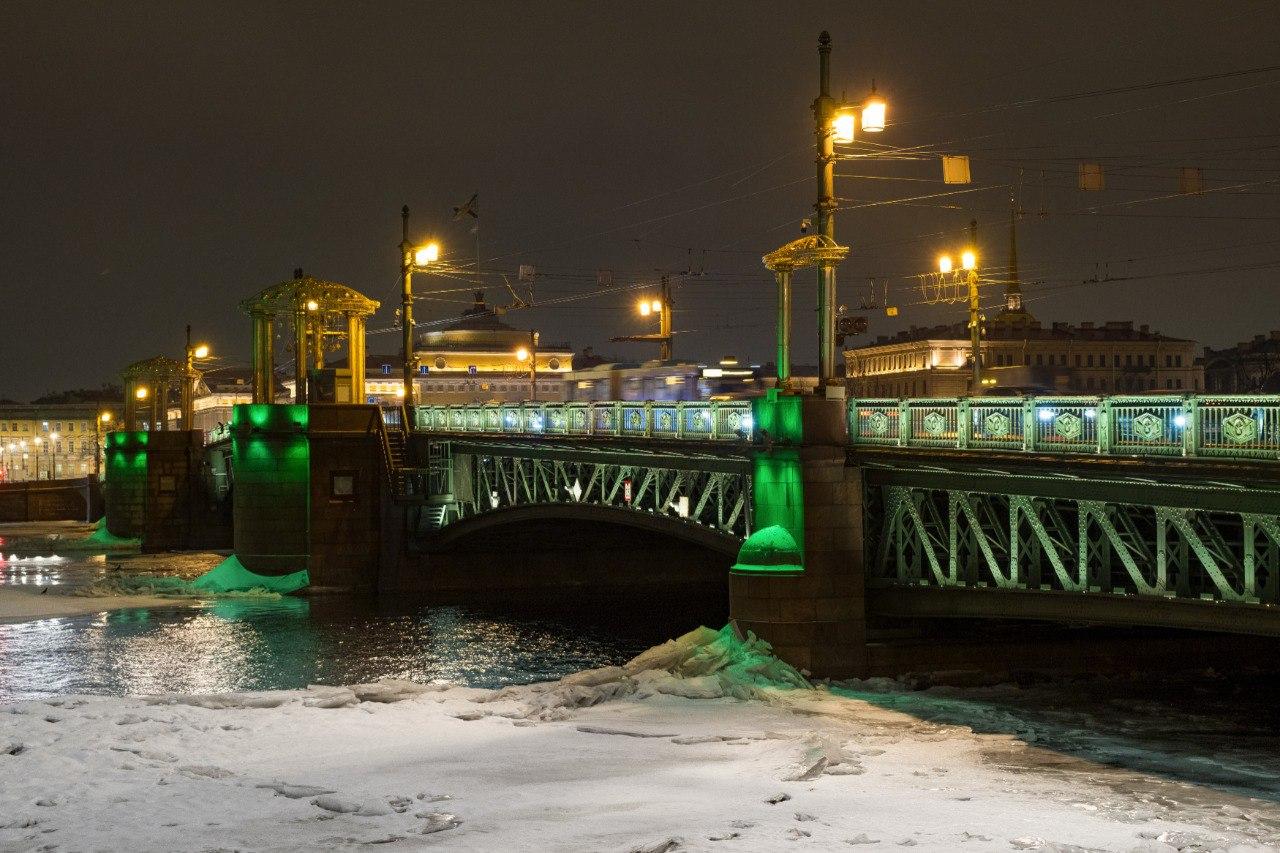 В Петербурге годовщину полного освобождения Ленинграда от блокады отметят масштабной световой акцией. С 17:10 27 января до 09:10 следующего дня городские мосты украсит архитектурно-художественная подсветка в цветах оливково-зеленой ленты Ленинградской Победы.