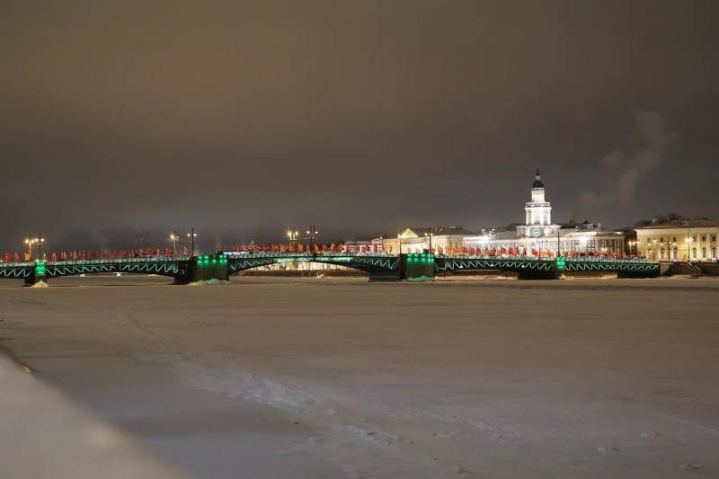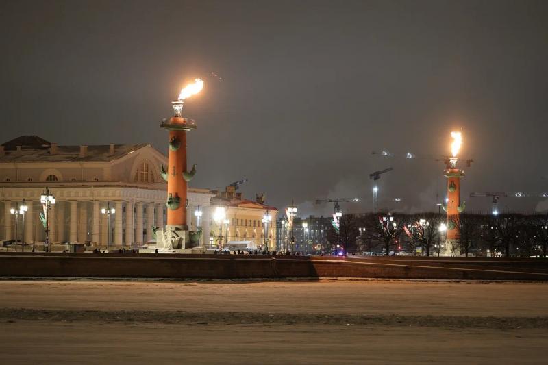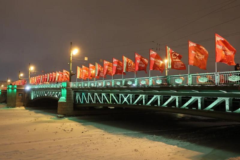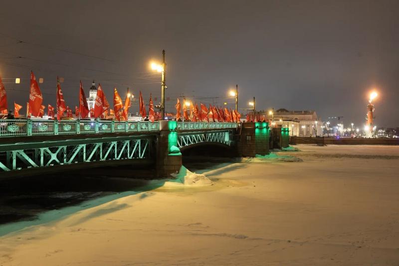 Также в память о героизме жителей блокадного города зажглись факелы Ростральных колонн. А три моста получили особую торжественную подсветку – в цветах ленты Ленинградской Победы.