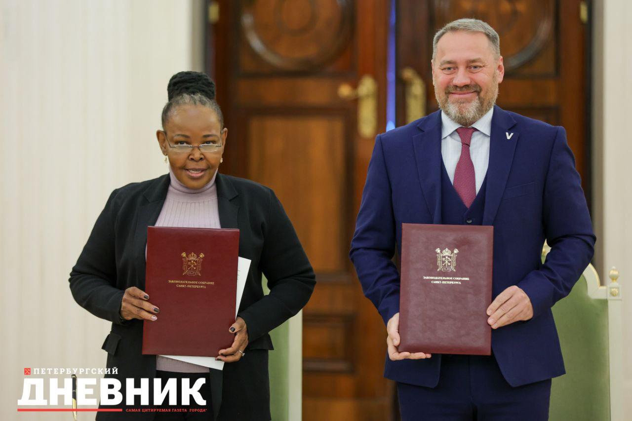 Председатель Законодательного собрания Петербурга Александр Бельский и спикер парламента провинции Гаутенг Уинифред Моракане Мосупье в Ротонде Мариинского дворца в среду, 28 января, подписали меморандум о взаимопонимании между регионами.