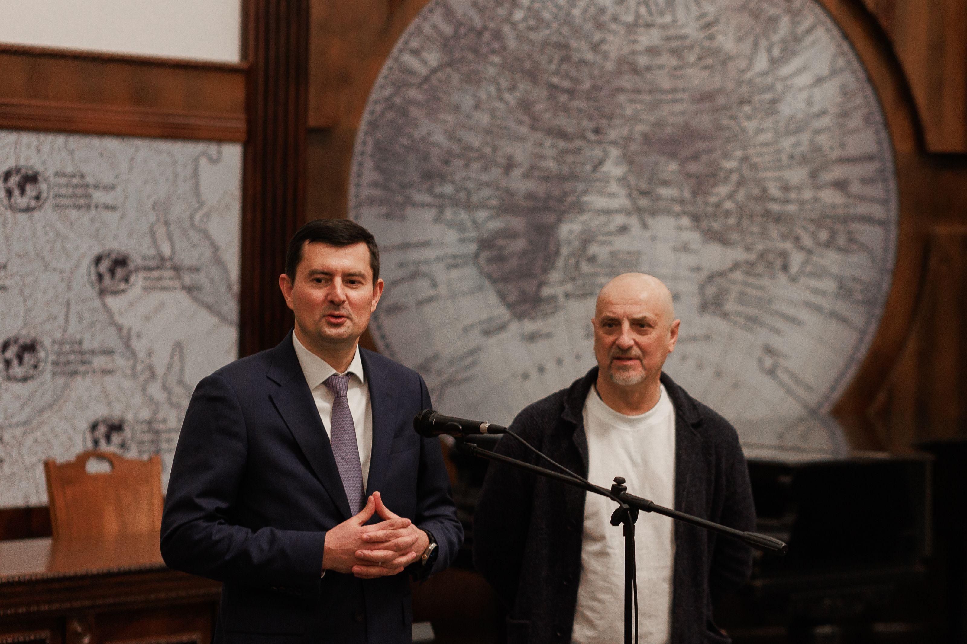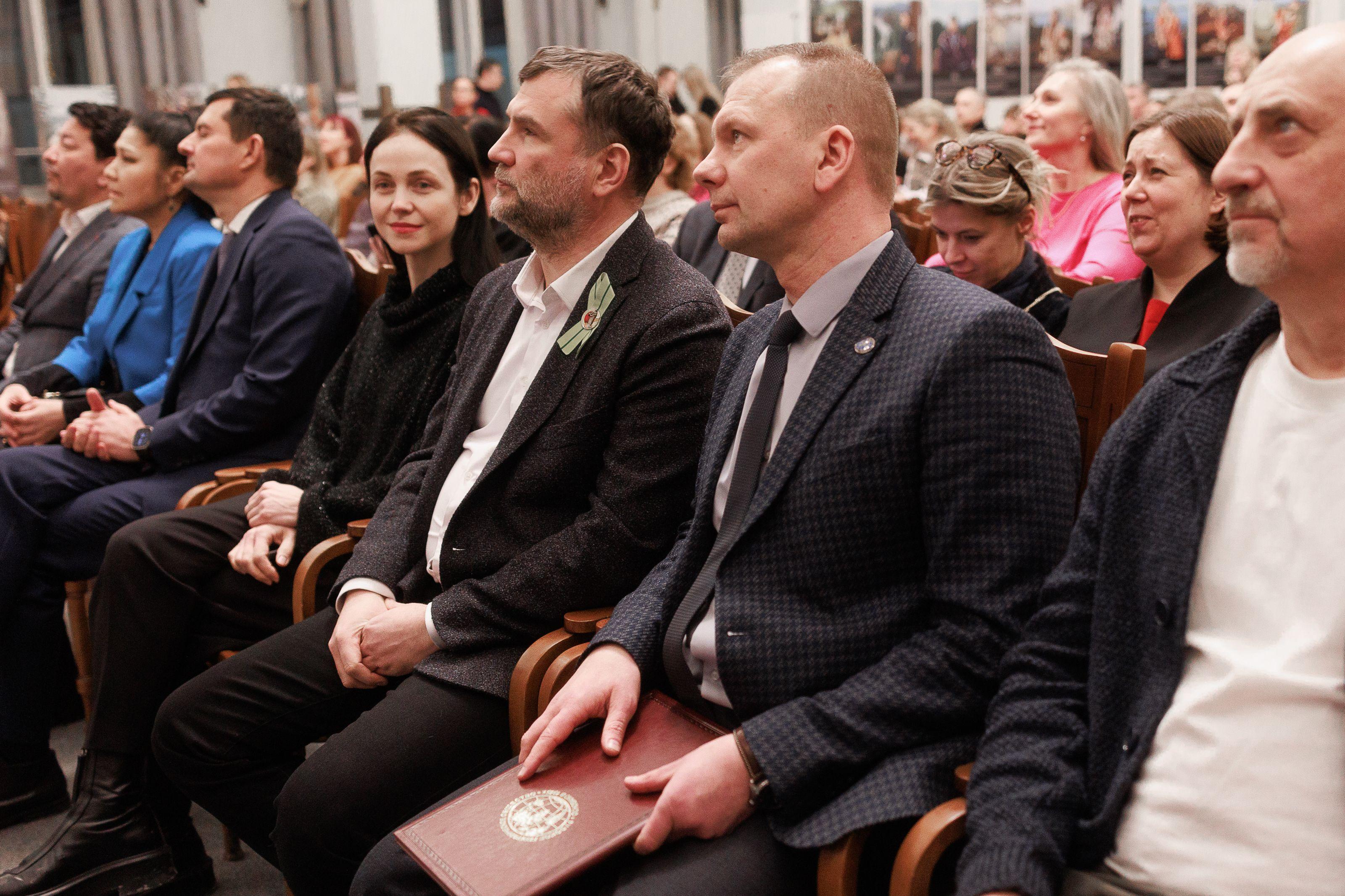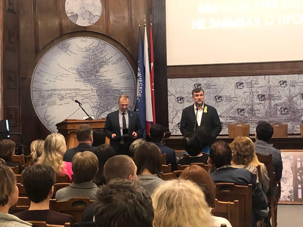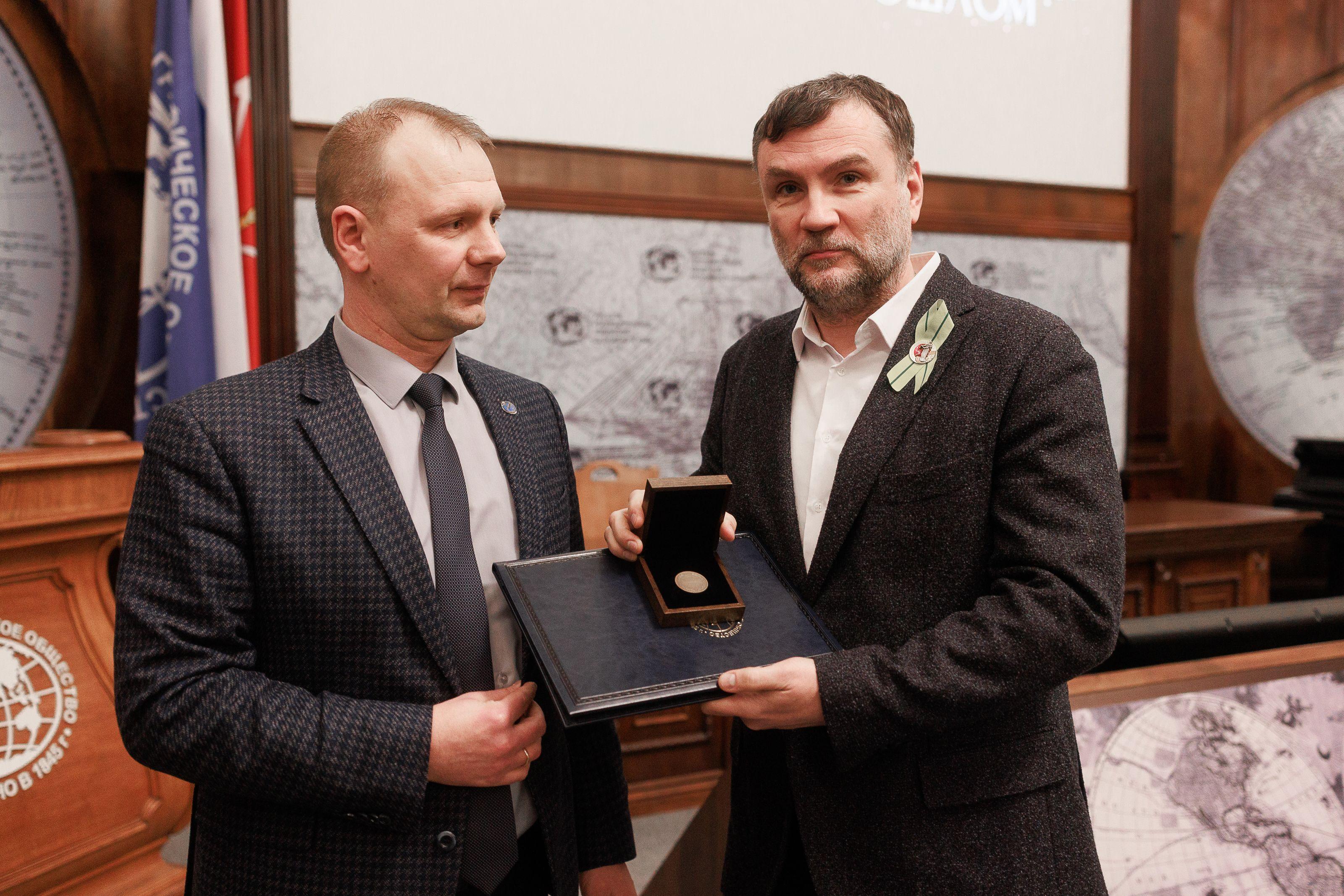 В день премьеры директор штаб-квартиры РГО в Петербурге Роман Рябинцев вручил Евгению Разумишкину малую бронзовую медаль.