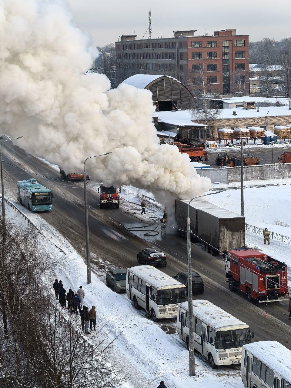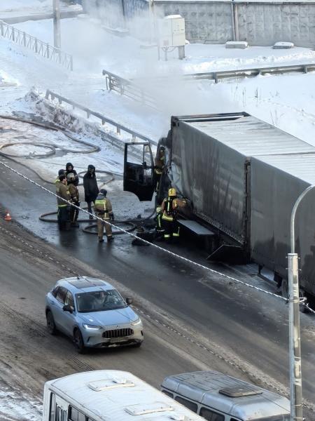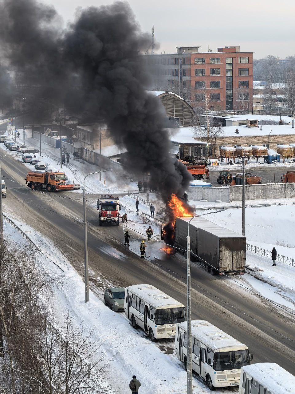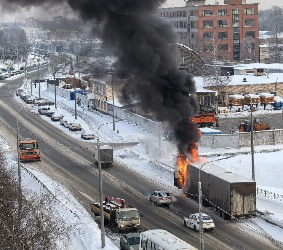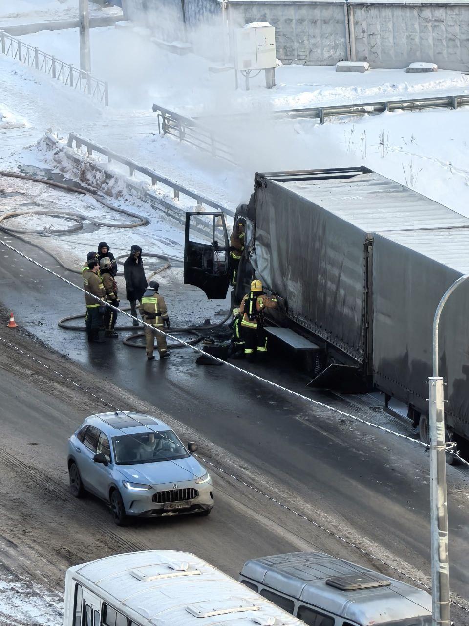 На опубликованных кадрах видно, что в грузовике полыхала кабина. Водитель, по всей видимости, успел выбежать из горящей машины, потому что сведения о пострадавших не поступали.