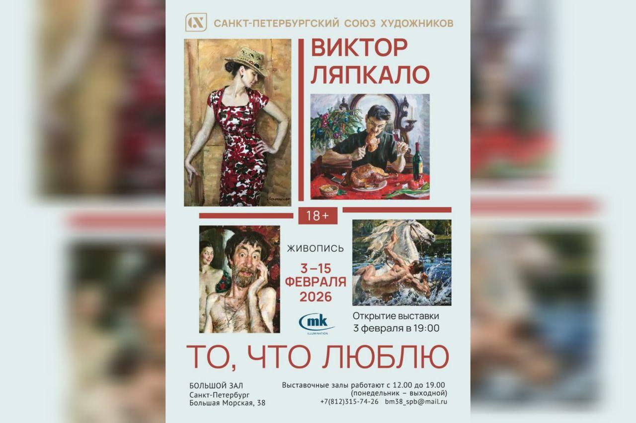 В Большом зале Санкт-Петербургского союза художников 3 февраля, в 19:00, состоится торжественное открытие масштабной персональной выставки Виктора Ляпкало «То, что люблю». Экспозиция, приурочена к 70-летию мастера и 20-летию его первой персональной выставки, состоявшейся в этих стенах.