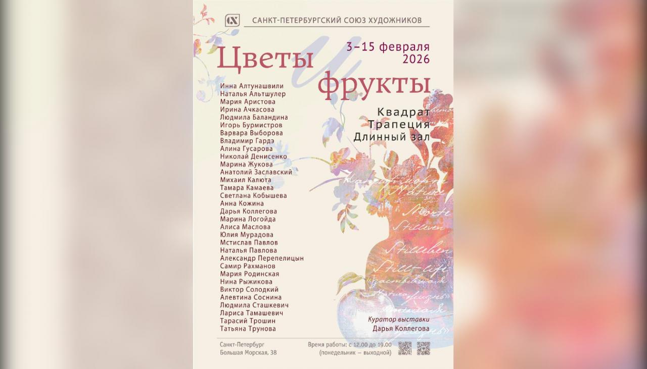 В понедельник, 3 февраля, в Длинном зале Санкт-Петербургского Союза художников (Большая Морская, 38) состоится открытие ежегодной выставки «Цветы и фрукты – 2026». В этом году проект объединит 32 современных автора, которые представят живописные, графические и скульптурные работы на тему натюрморта.