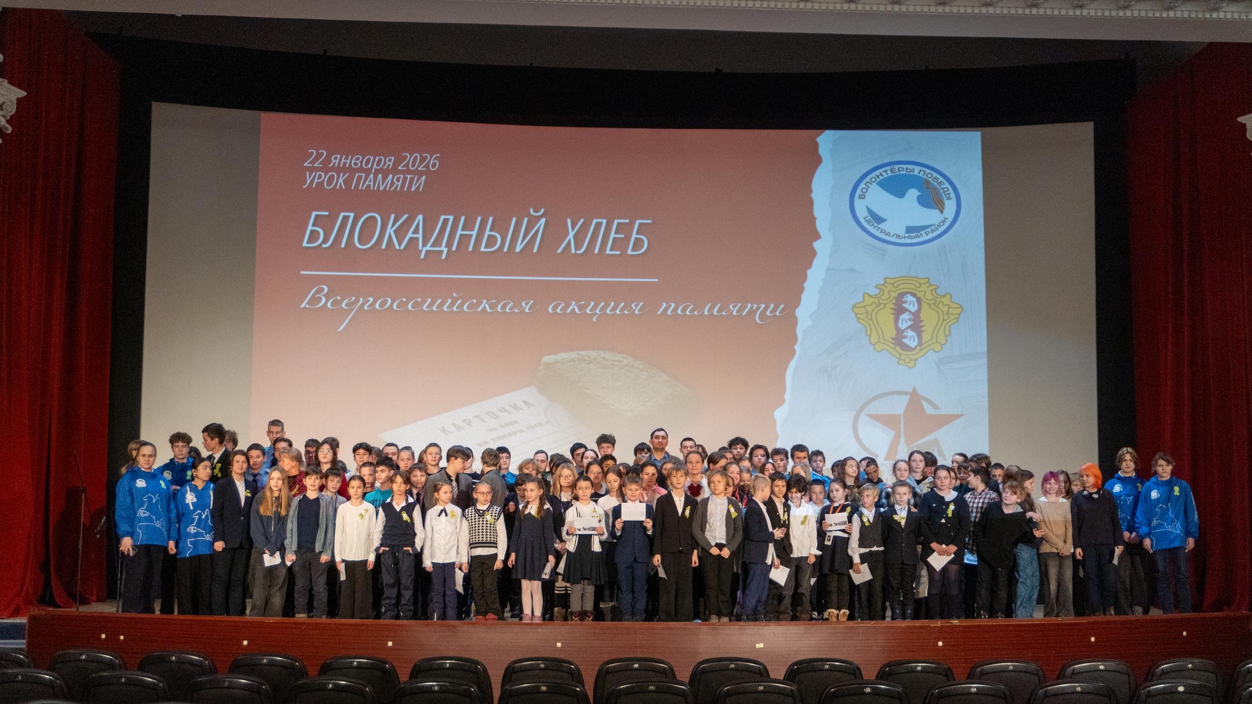 Работа шла и в школах. Волонтёры провели уроки памяти «Блокадный хлеб», рассказывая о жизни осаждённого города и показывая школьникам символ тех лет – кусочек хлеба весом 125 граммов. Самый масштабный урок прошёл в Доме кино, на него пришли 200 школьников Центрального района.