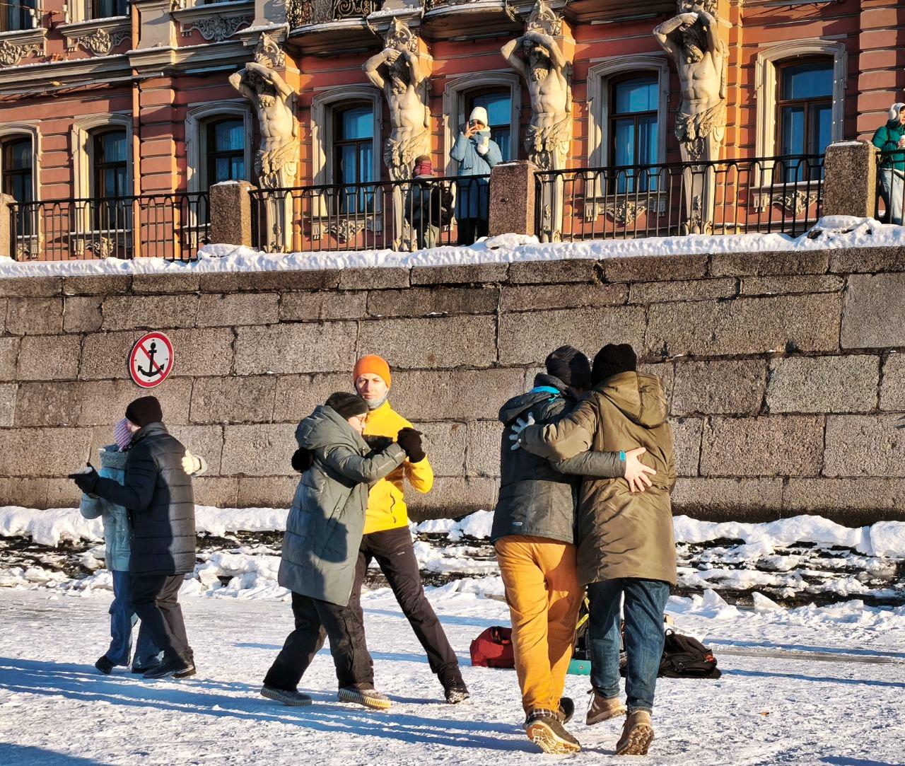 Петербуржцы в это морозное воскресенье устроили на льду Фонтанки танцевальную вечеринку.