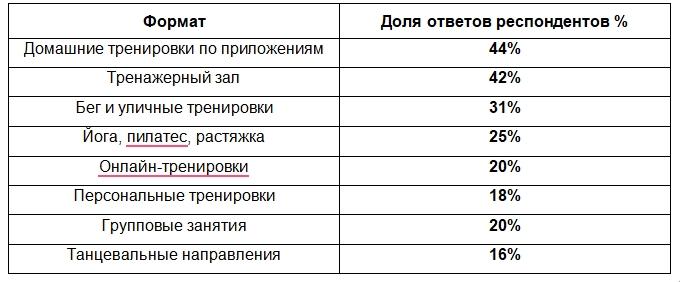 Самый популярный формат физической активности в 2026 году – занятия через приложения: этот вариант выбирают 44% участников опроса. Тренировки в фитнес-клубе привлекают около трети респондентов (42%), почти столько же выбирают бег и уличные занятия (31%). Йога, пилатес и растяжка интересуют 25% опрошенных, онлайн-тренировки с тренером – 20%. Персональные тренировки выбирают 18% участников, групповые программы – 20%, танцевальные направления – 16%.
