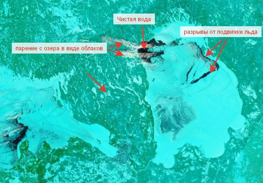 Благодаря морозной и безоблачной погоде, установившейся накануне, удалось получить удачный спутниковый снимок. На нем четко видны оставшаяся незамерзшей небольшая часть озера на северо-западе акватории, а также парение в виде облаков с этой открытой части, и подвижки льда в виде трещин под действием восточного ветра.