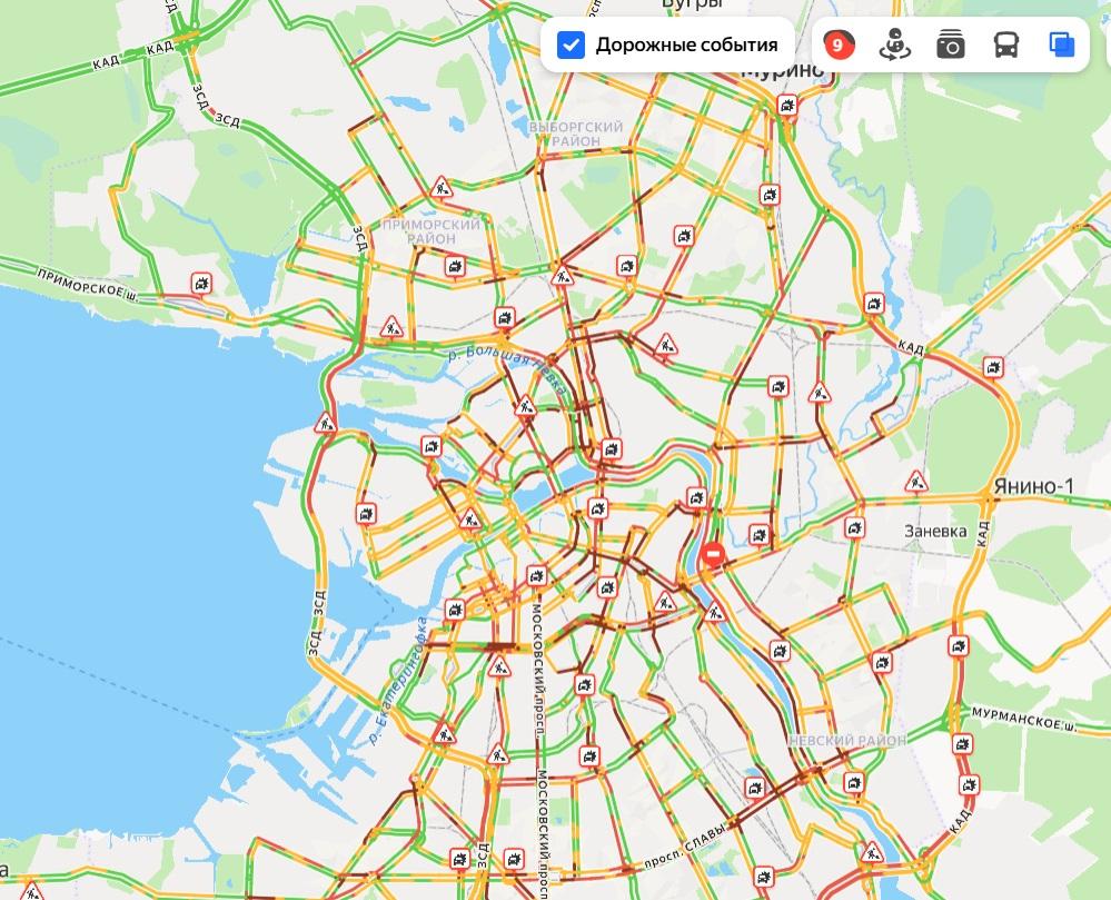 В Петербурге в понедельник вечером пробки составили девять баллов. Согласно сервису «Яндекс.Пробки», заторы есть почти во всех районах города.