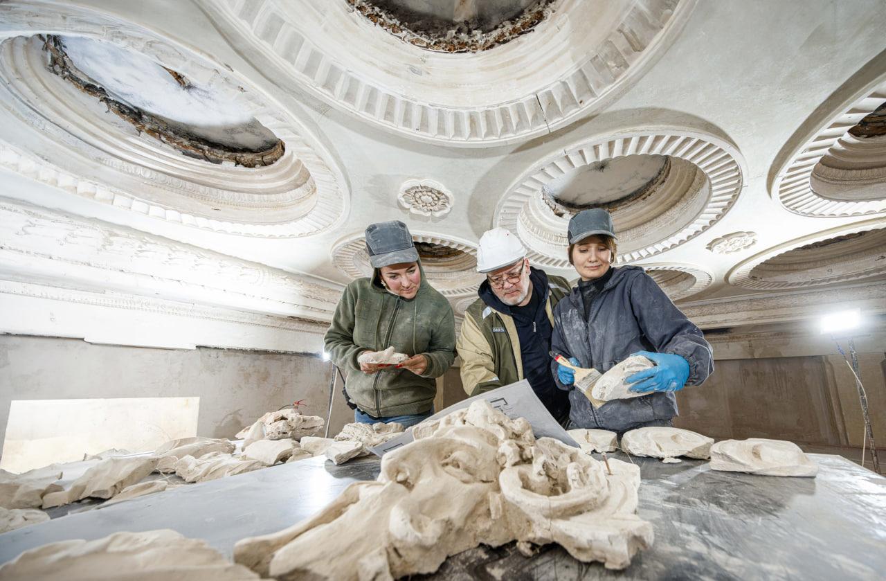 Во всем здании оштукатуривают стены, так как оригинальная штукатурка была сильно повреждена или утрачена, а в специальных образцовых помещениях проводят подготовительные работы для финального этапа реставрации. Специалисты подбирают колеры для окраски стен и реставрации паркета. Цветовые решения выверяют с помощью архивных данных и натурных исследований, чтобы обеспечить максимальное соответствие историческому облику.