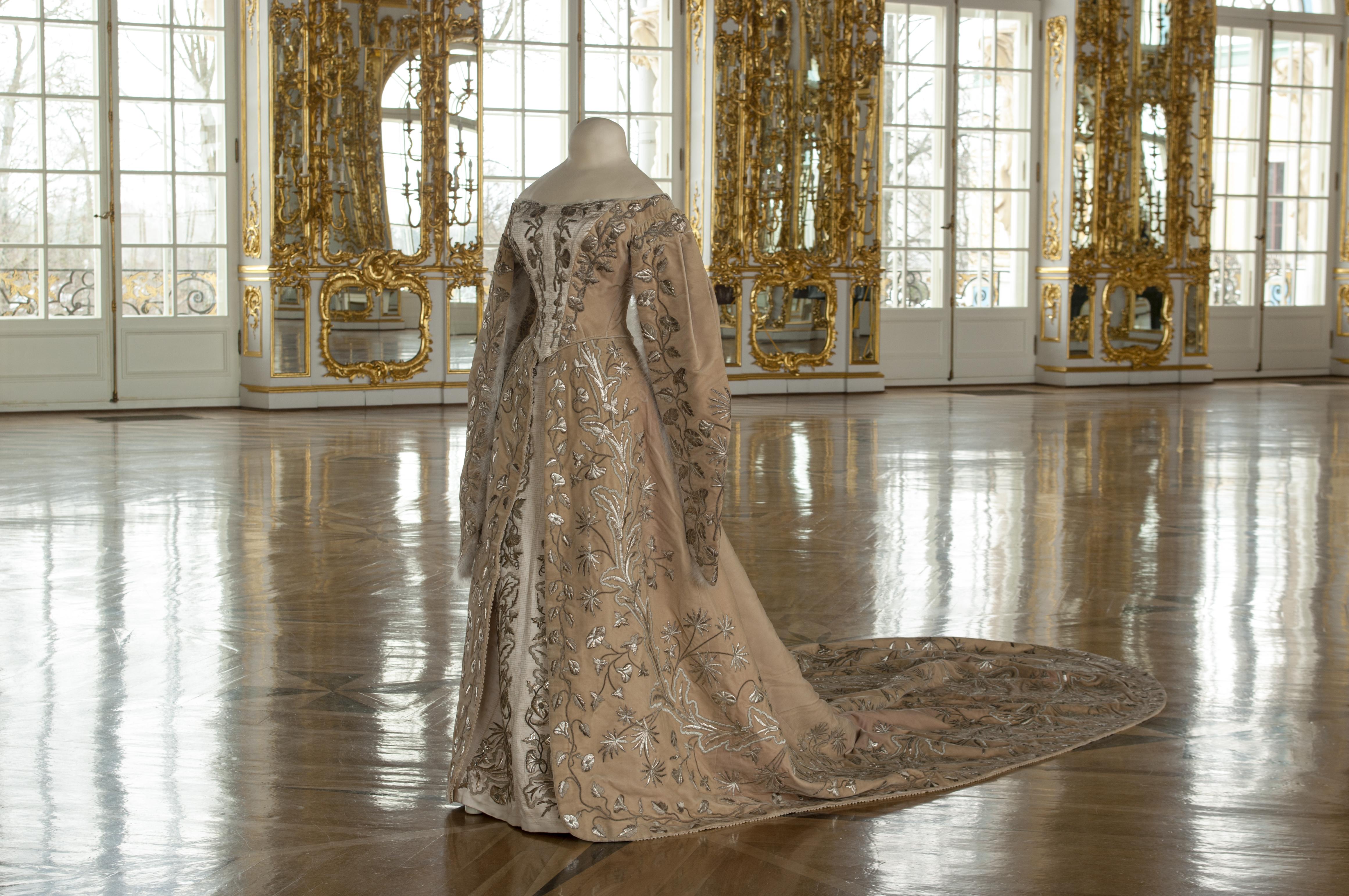 На выставке представят более 60 уникальных предметов: парадное платье великой княгини Ксении Александровны, фрейлинские и придворные костюмы, а также народные кокошники, платки и праздничные одежды XIX века из коллекции Русского Севера. Гости смогут увидеть все этапы создания золотной вышивки – от эскиза до готового изделия.