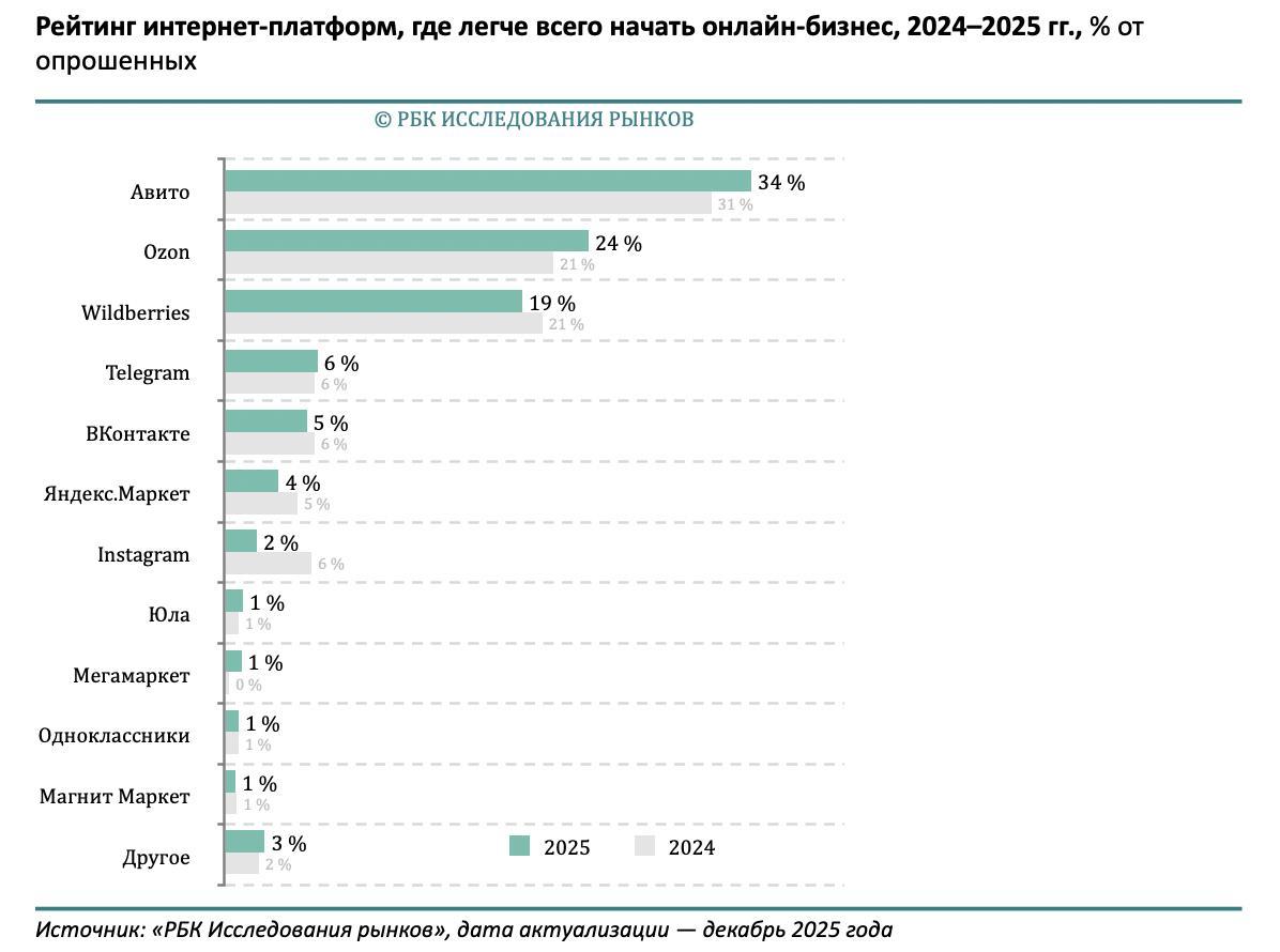 Исследование показало, что, по мнению наибольшей доли опрошенных (34%), проще всего начать онлайн-бизнес по продаже товаров на Авито. Ozon и Wildberries заняли второе и третье место с долями 24% и 19% соответственно. Также в топ-5 – Telegram (6%) и ВКонтакте (5%), однако эти площадки идут с большим отрывом от тройки лидеров.