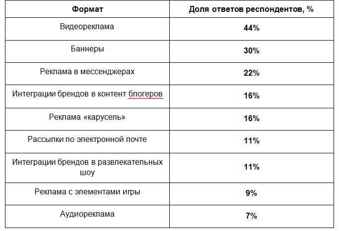 Среди рекламных форматов, которые чаще влияют на принятие решения о покупке, пользователи называли видеорекламу — 44%. Баннерные форматы с изображением и текстом на сайтах и в приложениях отметили 30% опрошенных, рекламу в мессенджерах — 22%. Интеграции брендов в контент блогеров и формат «карусель» указали по 16% участников опроса. Рассылки по электронной почте и интеграции в развлекательных шоу отметили по 11% респондентов, рекламу с элементами игры — 9%, аудиорекламу — 7%.