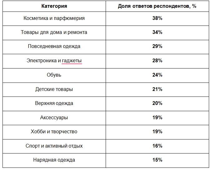 Чаще всего после просмотра рекламы пользователи покупали косметику и парфюмерию — этот вариант указали 38% участников опроса. Далее следуют товары для дома и ремонта (34%), повседневная одежда (29%), а также электроника и гаджеты (28%). Обувь приобретали 24% респондентов, детские товары — 21%, верхнюю одежду — 20%. Аксессуары и товары для хобби и творчества отметили по 19% опрошенных, товары для спорта и активного отдыха — 16%.