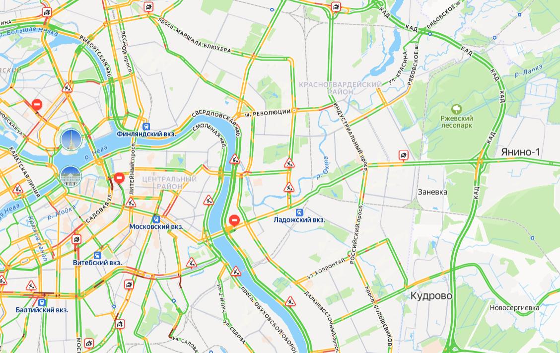 Общая загруженность дорог в Петербурге сейчас составляет 4 «желтых» балла.