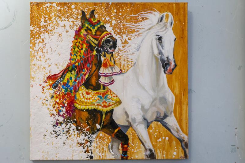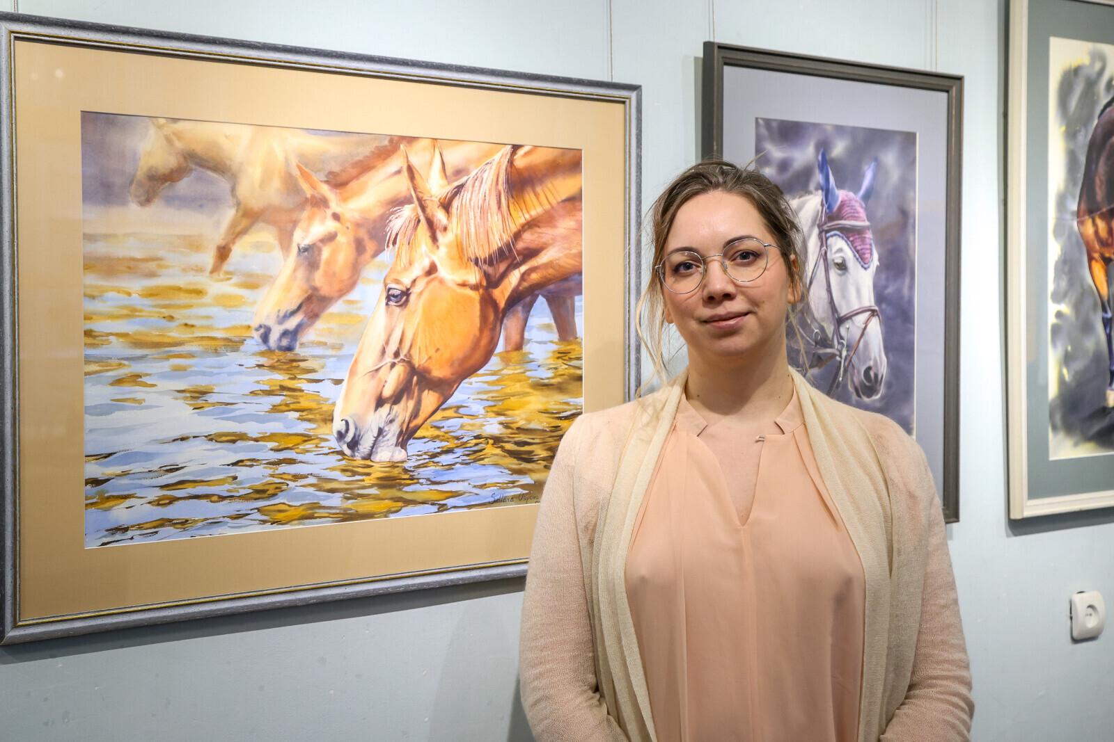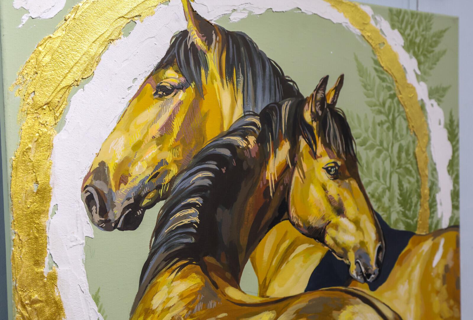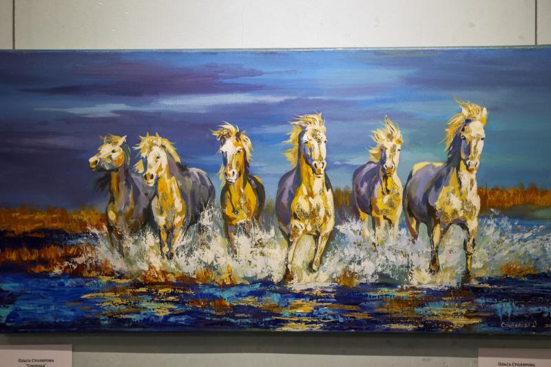 Еще одним событием выставки стала премьера картины Ольги Столяровой «Дракон», где изображены три лошади. «Эта работа для меня глубоко эмоциональная. Одна лошадь спокойная, другая уверенная, третья – целеустремленная. Всё как у людей», – шутит художница.