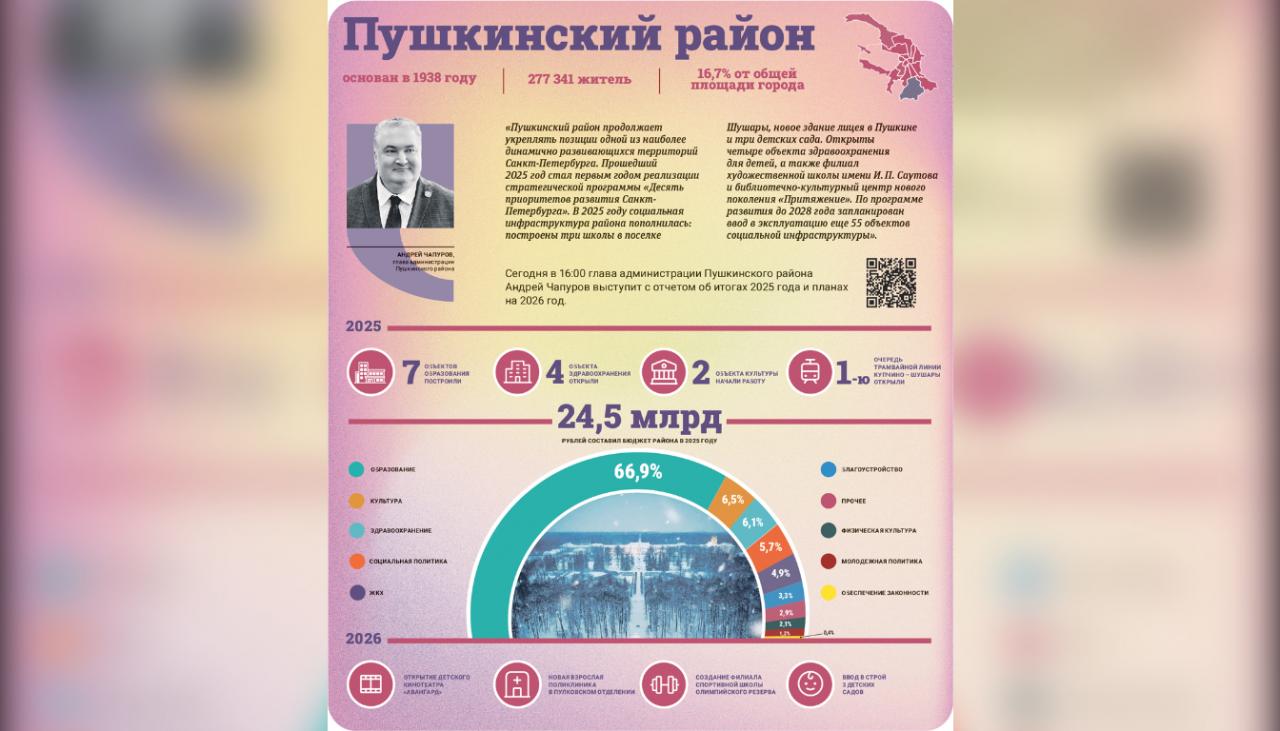 «Пушкинский район продолжает укреплять позиции одной из наиболее динамично развивающихся территорий Санкт‑Петербурга. Прошедший 2025 год стал первым годом реализации стратегической программы «Десять приоритетов развития Санкт-Петербурга». В 2025 году социальная инфраструктура района пополнилась: построены три школы в поселке Шушары, новое здание лицея в Пушкине и три детских сада. Открыты четыре объекта здравоохранения для детей, а также филиал художественной школы имени И. П. Саутова и библиотечно‑культурный центр нового поколения «Притяжение». По программе развития до 2028 года запланирован ввод в эксплуатацию еще 55 объектов социальной инфраструктуры», – подчеркнул он.
