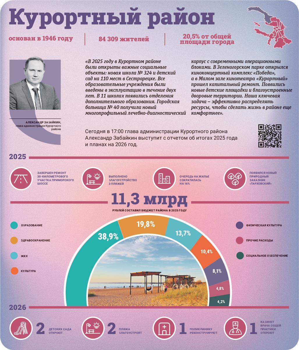 «В 2025 году в Курортном районе были открыты важные социальные объекты: новая школа № 324 и детский сад на 110 мест в Сестрорецке. Все образовательные учреждения были введены в эксплуатацию в течение двух лет. В 11 школах появились отделения дополнительного образования. Городская больница №40 получила новый многопрофильный лечебно‑диагностический корпус с современными операционными блоками. В Зеленогорском парке открылся киноконцертный комплекс «Победа», а в Малом зале кинотеатра «Курортный» прошел капитальный ремонт. Появились новые детские площадки и благоустроенные дворовые территории. Наша ключевая задача – эффективно распределять ресурсы, чтобы сделать жизнь в районе еще комфортнее», – сказал глава администрации Курортного района Александр Забайкин.