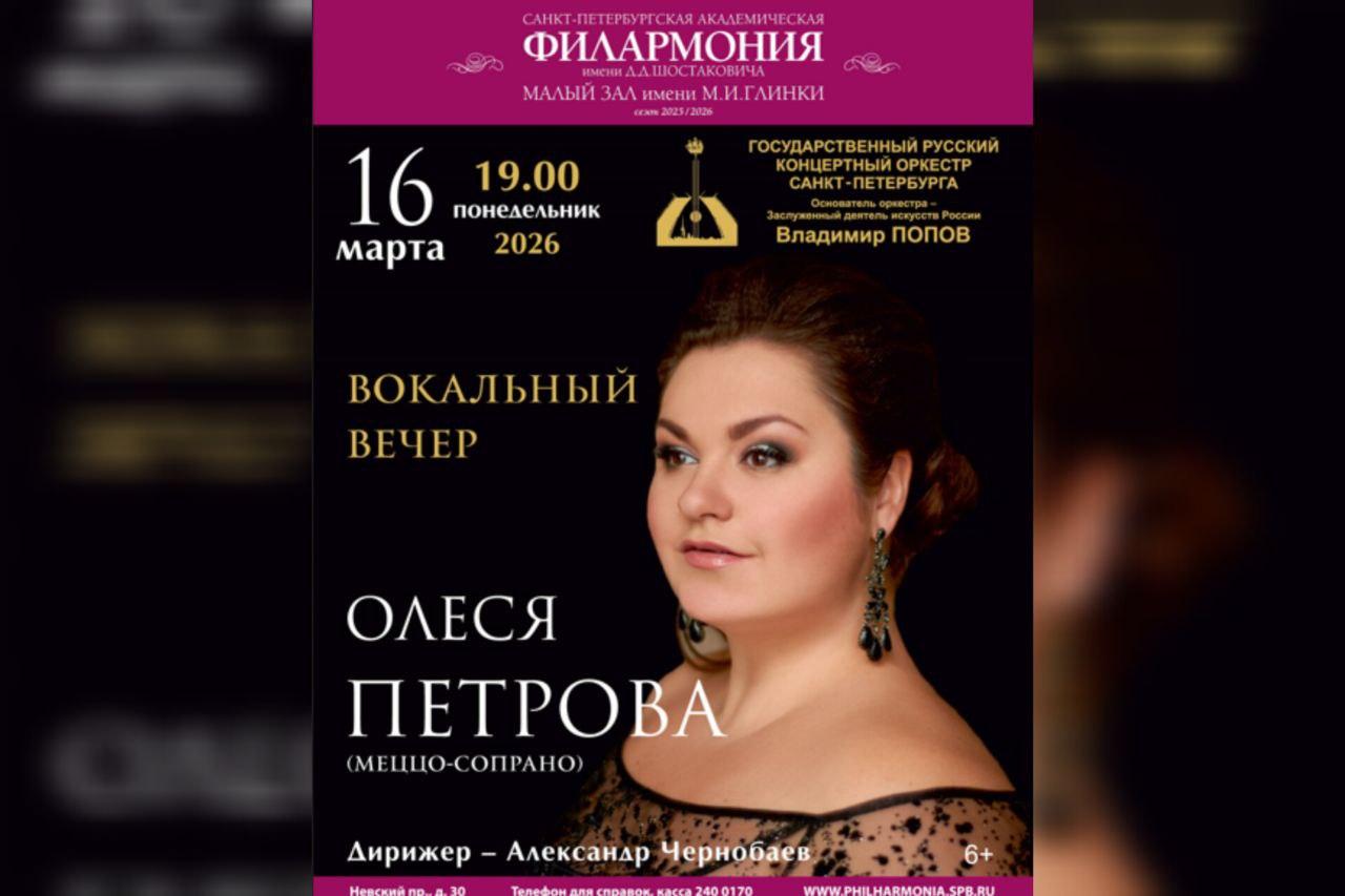 На сцене малого зала Филармонии Санкт-Петербурга 16 марта пройдет сольный концерт меццо-сопрано Олеси Петровой в сопровождении Государственного Русского концертного оркестра Санкт-Петербурга (основатель – заслуженный деятель искусств России Владимир Попов). Об этом сообщает пресс-служба организаторов.