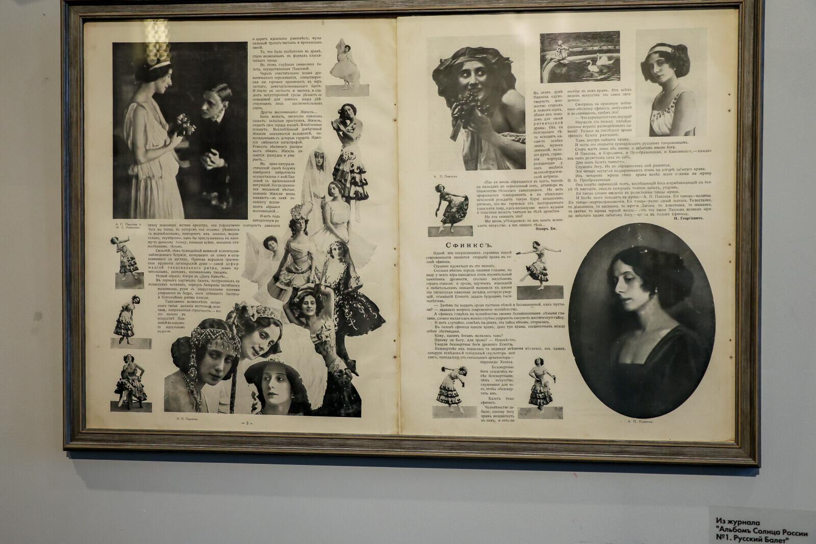 На первом этаже представлены журналы, которые выходили во время дягилевских сезонов, подлинные фотографии Анны Павловой и публикации, посвященные ей. Здесь же представлены картины современных художников.