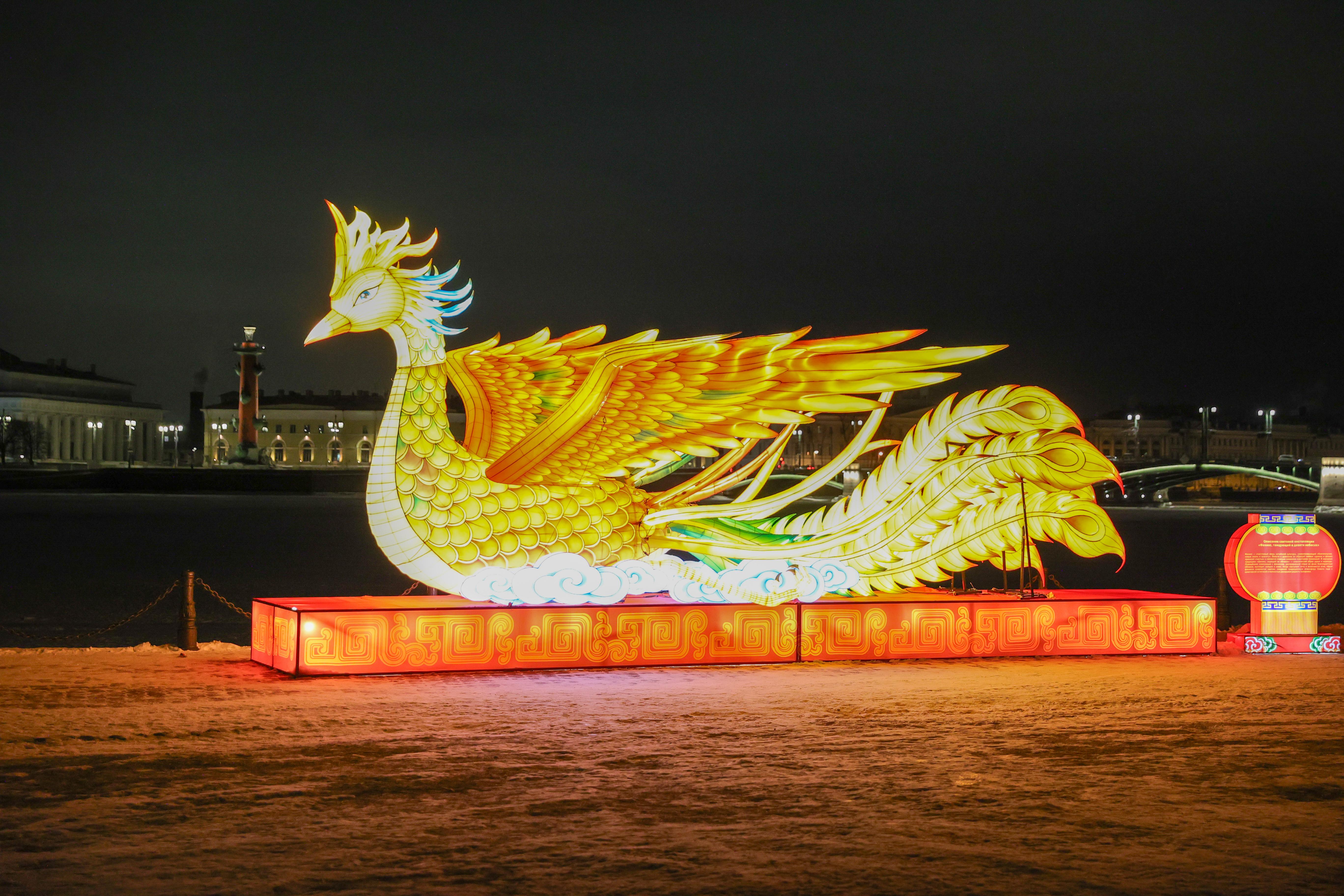 На стрелке Заячьего острова, в Петропавловской крепости, в честь китайского Нового года открылась выставка сычуаньских фонарей. Впрочем, слово «фонари» слабо передает разлившуюся по стрелке феерию света, ведь правительство Сычуани передало в дар Санкт-Петербургу десять полноценных инсталляций с главными символами Поднебесной.