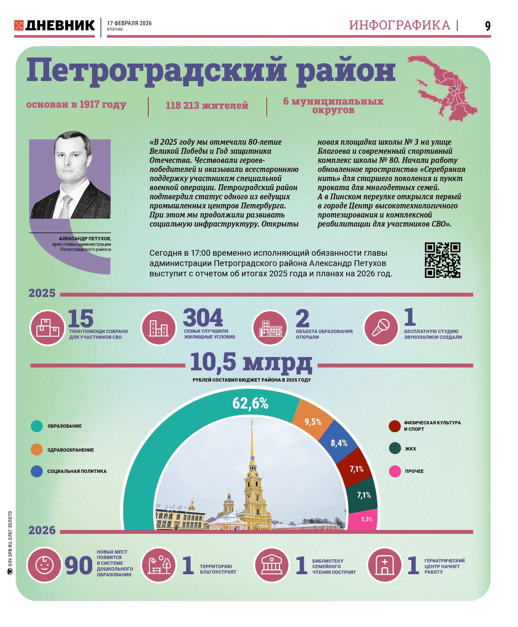 «В 2025 году мы отмечали 80‑летие Великой Победы и Год защитника Отечества. Чествовали героев‑победителей и оказывали всестороннюю поддержку участникам специальной военной операции. Петроградский район подтвердил статус одного из ведущих промышленных центров Петербурга. При этом мы продолжили развивать социальную инфраструктуру. Открыты новая площадка школы № 3 на улице Благоева и современный спортивный комплекс школы № 80. Начали работу обновленное пространство «Серебряная нить» для старшего поколения и пункт проката для многодетных семей. А в Пинском переулке открылся первый в городе Центр высокотехнологичного протезирования и комплексной реабилитации для участников СВО», – сказал врио главы администрации Петроградского района Александр Петухов.