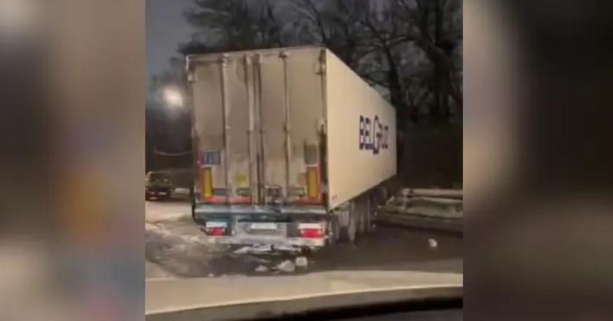 Машины сейчас могут проехать только по одной из трех полос. Две другие «захватил» грузовик. Его кабину развернуло на трассе.