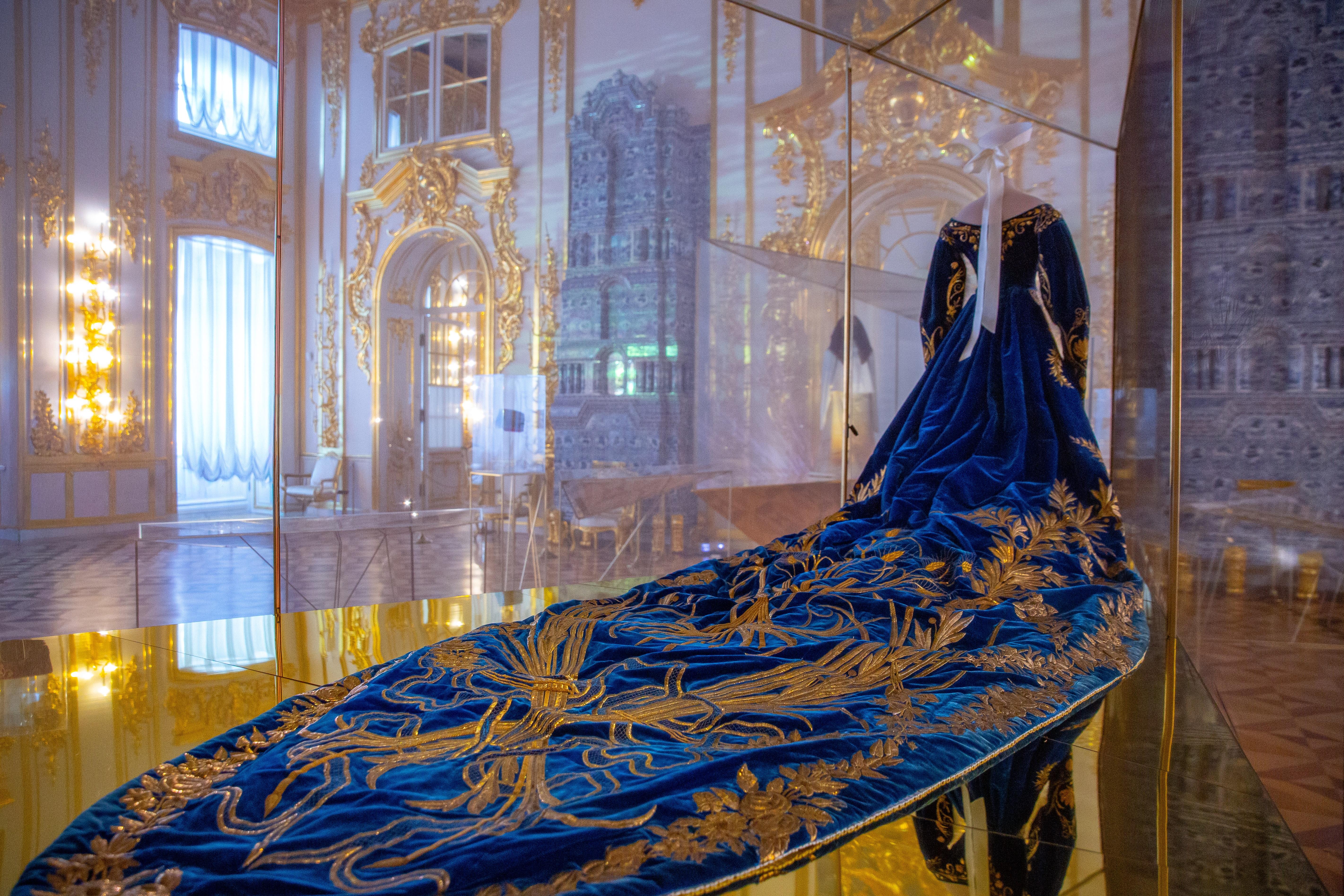 В Антикамерах дворца и частично в Большом зале представили более 60 предметов из коллекций обоих музеев. Это придворные платья и мундиры представителей императорского двора, а также головные уборы жительниц Русского Севера.