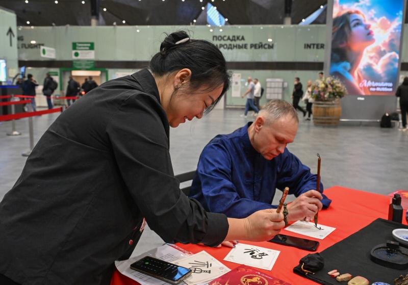 Стойки регистрации китайских авиакомпаний украсили красными шарами, а в центре зала отплясывал желтый дракон. За специальным столиком трудился мастер каллиграфии, которому можно было заказать изготовление новогодней открытки с иероглифом «любовь», «весна» или «дракон». Восточная каллиграфия – особый вид искусства, скорее отсылающее к психологии, чем к живописи. Закончился праздник дегустацией огромного красного торта.