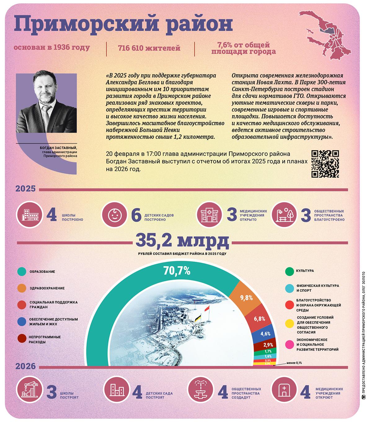 «В 2025 году при поддержке губернатора Александра Беглова и благодаря инициированным им 10 приоритетам развития города в Приморском районе реализован ряд знаковых проектов, определяющих престиж территории и высокое качество жизни населения. Завершилось масштабное благоустройство набережной Большой Невки протяженностью свыше 1,2 километра. Открыта современная железнодорожная станция Новая Лахта. В парке 300-летия Санкт-Петербурга построен стадион для сдачи нормативов ГТО. Открываются уютные тематические скверы и парки, современные игровые и спортивные площадки. Повышается доступность и качество медицинского обслуживания, ведется активное строительство образовательной инфраструктуры», – отметил глава администрации Приморского района Богдан Заставный.