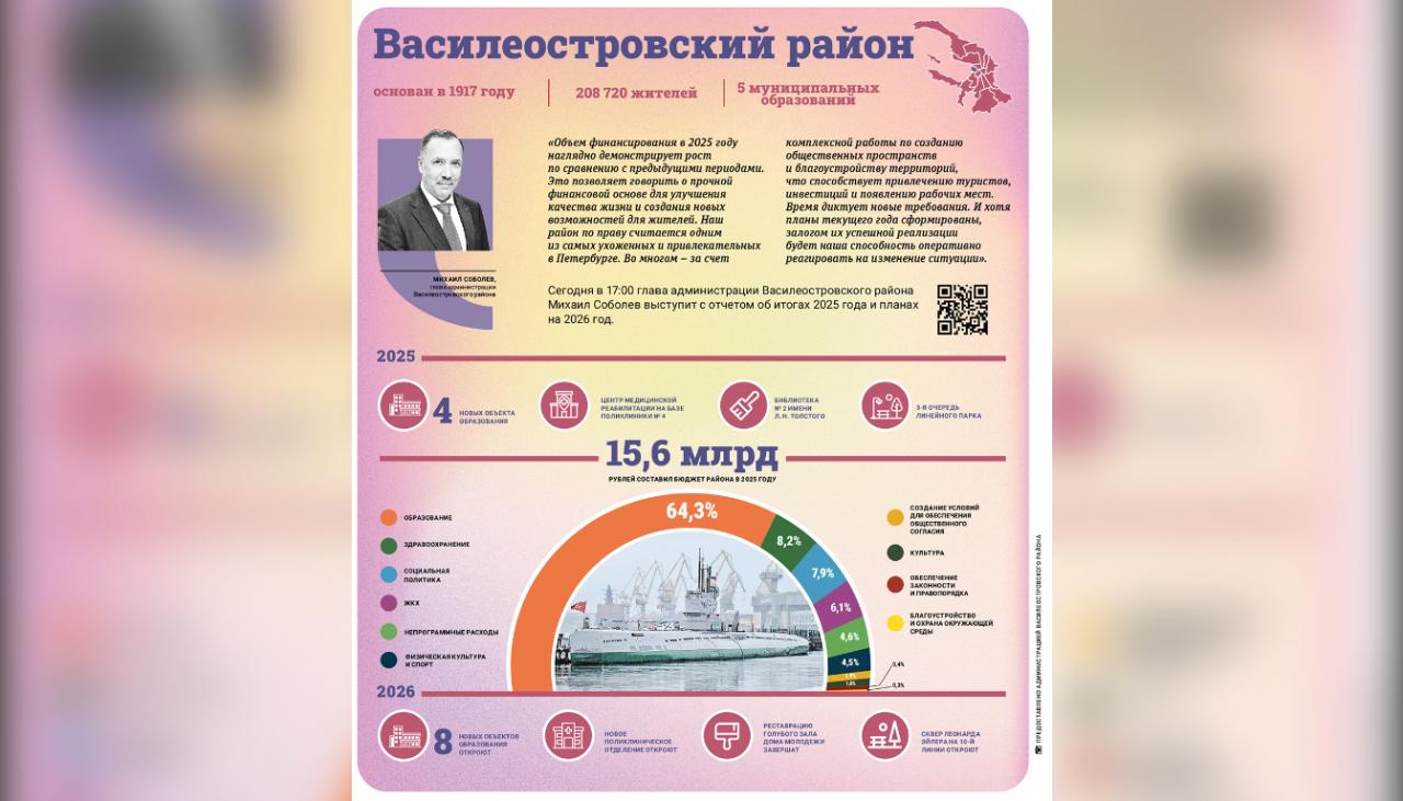 Василеостровский район Санкт-Петербурга был основан в 1917 году, население составляет 208 720 жителей. В районе расположены пять муниципальных образований. Сегодня в 17:00 глава администрации Василеостровского района Михаил Соболев выступит с отчетом об итогах 2025 года и планах на 2026 год.