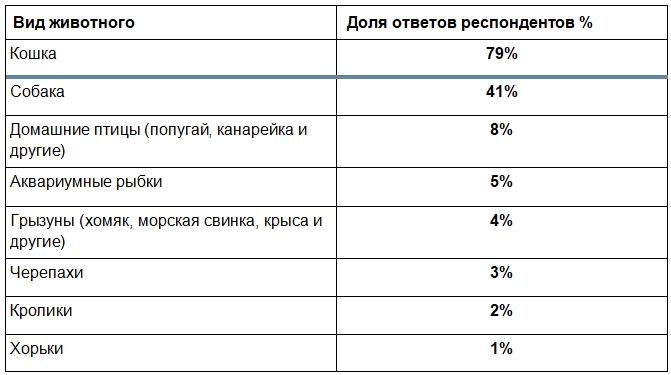 Самыми популярными питомцами остаются кошки – их держат 79% владельцев животных. Собаки есть у 41% опрошенных. Значительно реже респонденты заводят птиц – 8%, аквариумных рыбок – 5%, грызунов – 4%, черепах – 3%, кроликов – 2%, хорьков – 1%.