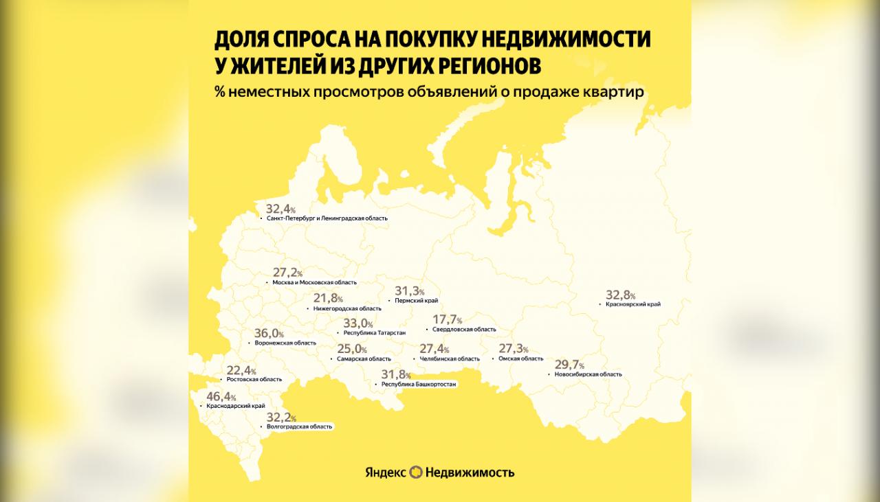 По данным аналитического исследования «Яндекс Недвижимости», доля внешнего спроса (просмотров объявлений о продаже жилья из других регионов) на недвижимость в Санкт-Петербурге и Ленинградской области составляет 32,4%. В основном покупкой жилья здесь интересуются жители Москвы и Подмосковья, а также Краснодарского края, Свердловской, Новосибирской и Мурманской областей – в сумме на них приходится 13,9% просмотров.