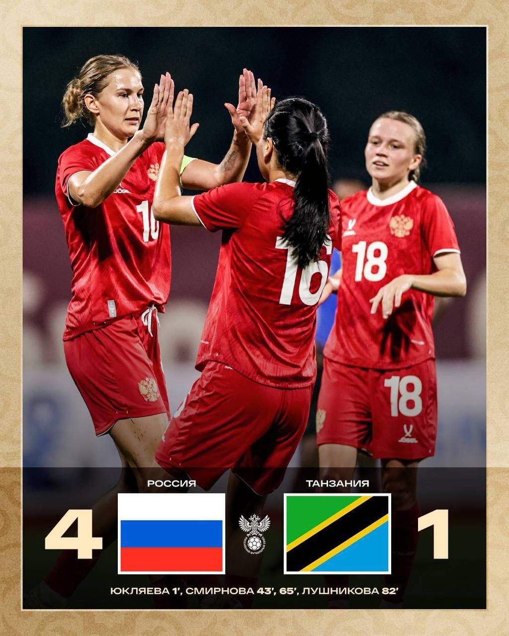 Женская сборная России по футболу начала выступление на международном турнире в городе Шарджа, ОАЭ. В первом матче сборная России встретилась с Танзанией и разгромила соперника со счётом 4:1. Об этом сообщили в Российском футбольном союзе.