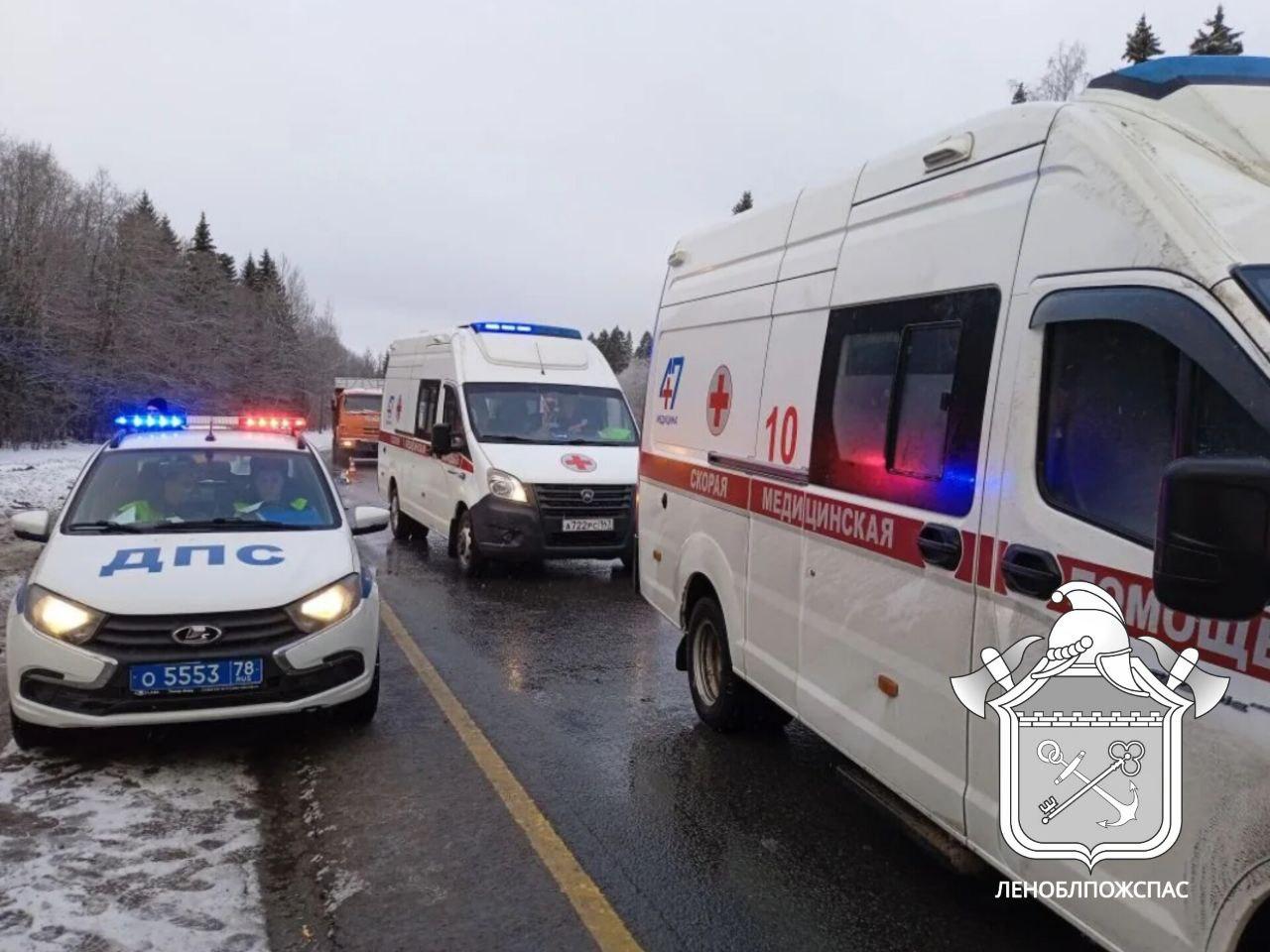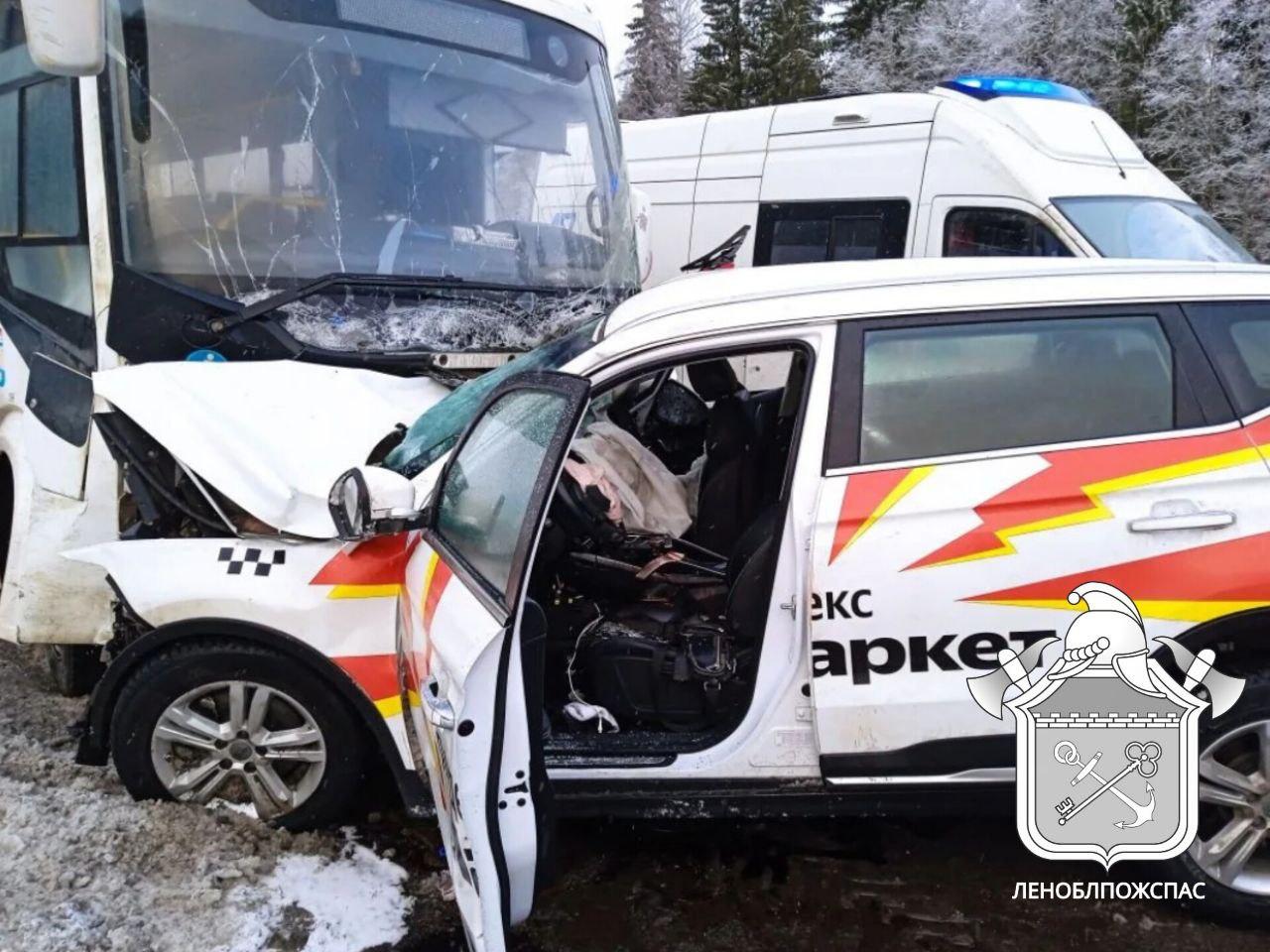 Пассажирский автобус лоб в лоб врезался в легковушку на трассе под Волосово
