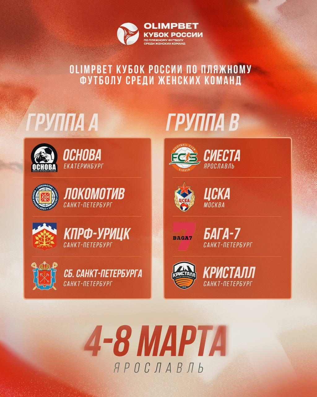 В Ярославле 4 марта стартует четвёртый в истории розыгрыш Кубка России по пляжному футболу среди женских команд. В турнире примут участие восемь клубов, пять из которых представляют Санкт-Петербург.
