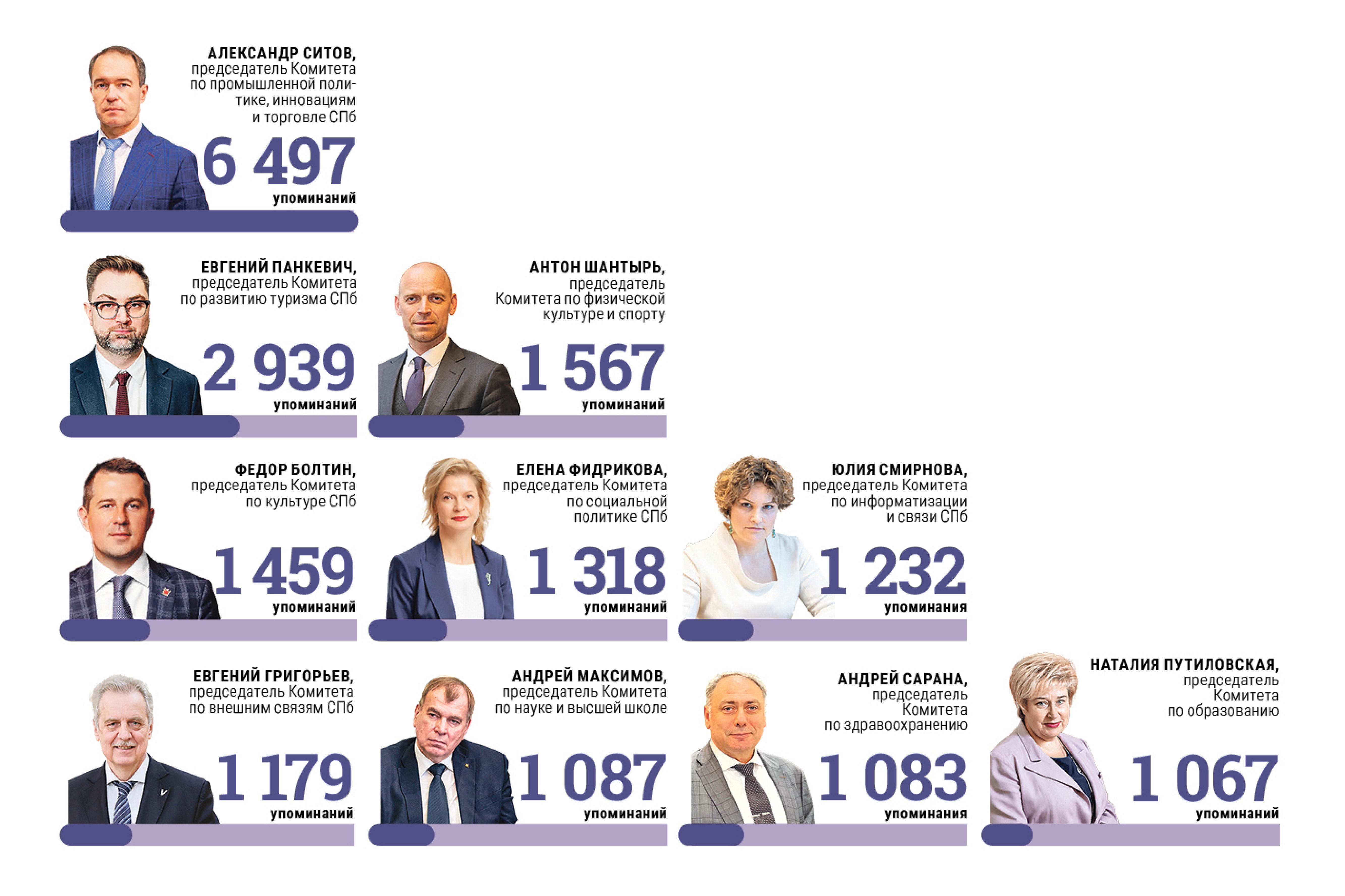 Как отмечается в исследовании, Александр Ситов набрал 6497 упоминаний, на второй строчке рейтинга оказался председатель Комитета по развитию туризма Петербурга Евгений Панкевич (2939 упоминаний), а на третьем месте обосновался председатель Комитета по физической культуре и спорту Антон Шантырь (1567 упоминаний).