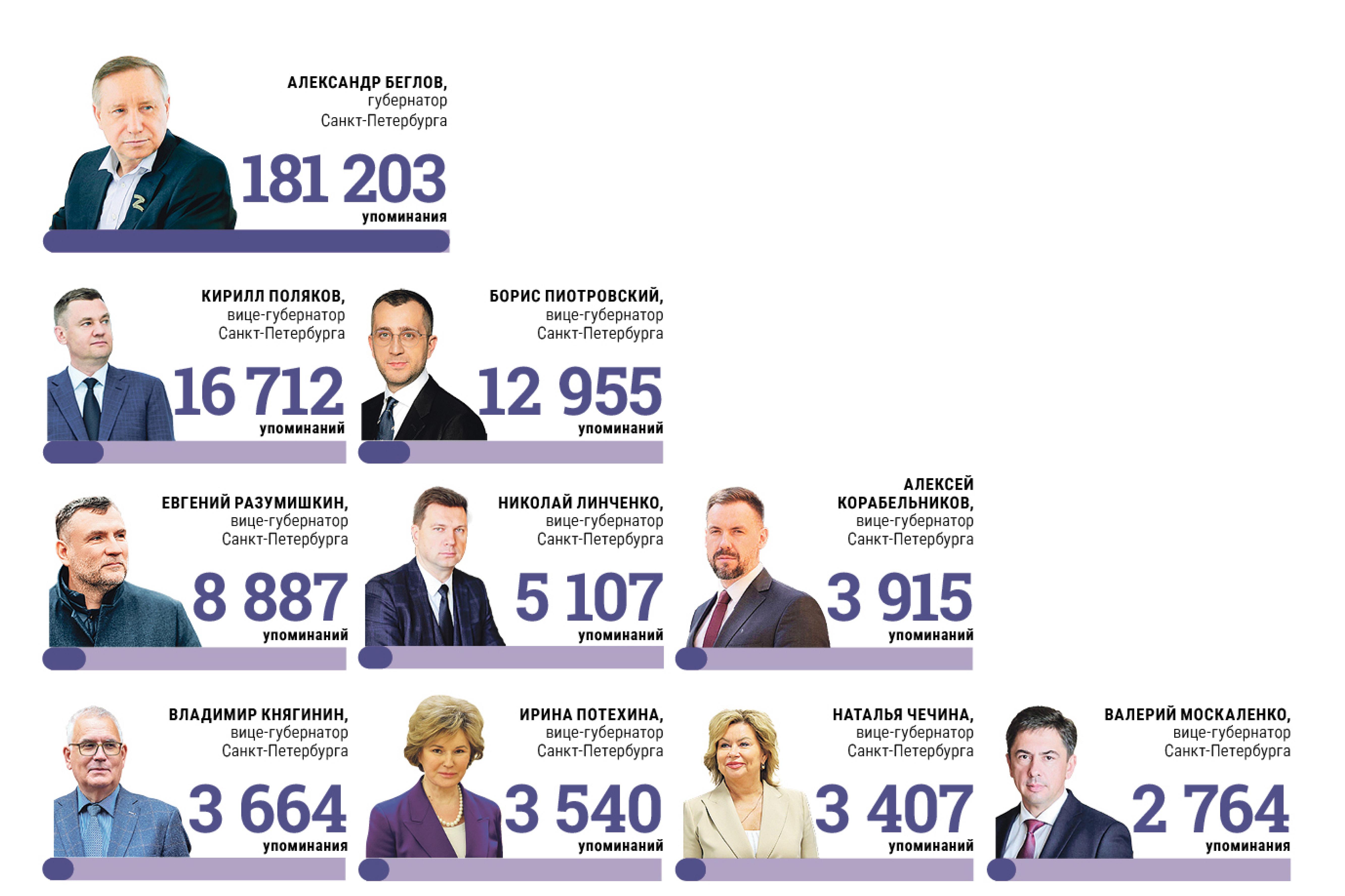 На третьем месте по упоминаемости – вице-губернатор Борис Пиотровский. Это отражение того, что Петербург все же сохраняет свою роль ключевого ньюсмейкера в федеральной и международной повестке – благодаря Русскому музею, Эрмитажу, Мариинскому театру и другим нашим культурным центрам. Эти два направления образа города – промышленный и культурный – на сегодня являются равновеликими», – говорит политолог.