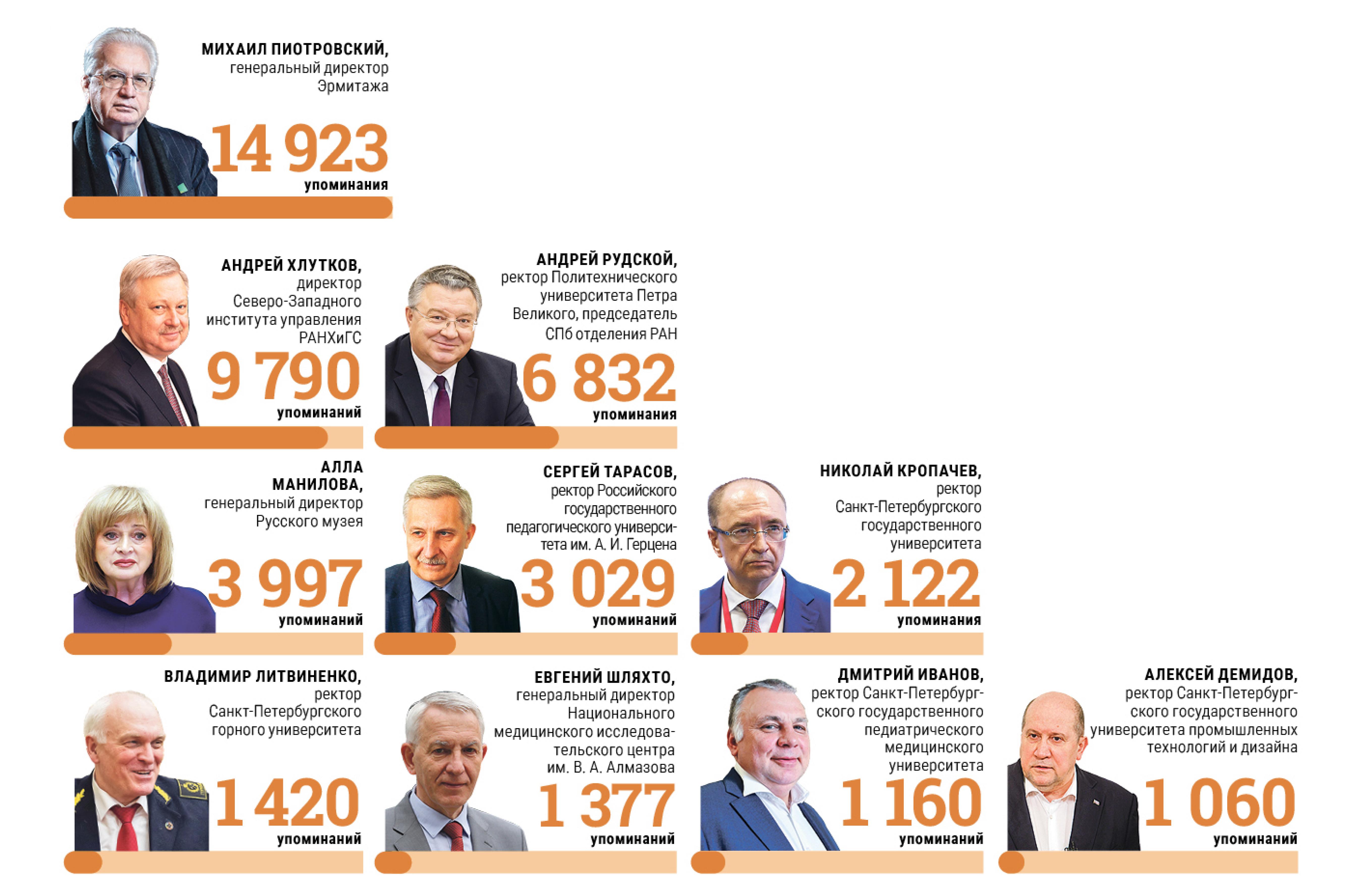 Как отмечается в исследовании, Михаил Пиотровский набрал 14 923 упоминания, на второй строчке рейтинга оказался директор Северо-Западного института управления РАНХиГС Андрей Хлутков (9790 упоминаний), а на третьем месте расположился ректор Политехнического университета Петра Великого, председатель СПб отделения РАН Андрей Рудской (6832 упоминания).