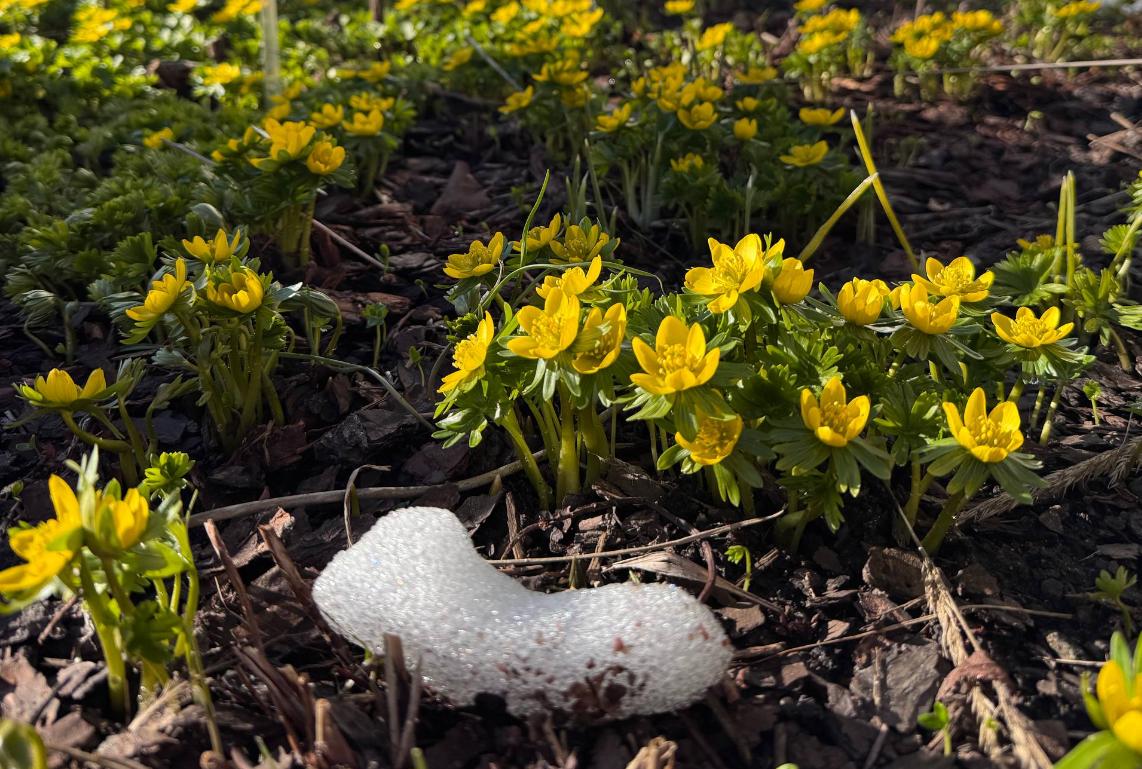Речь идёт о весеннике зимнем (Eranthis hyemalis) из семейства лютиковых. Сотрудники сада приглашают гостей заглянуть на Северный двор.