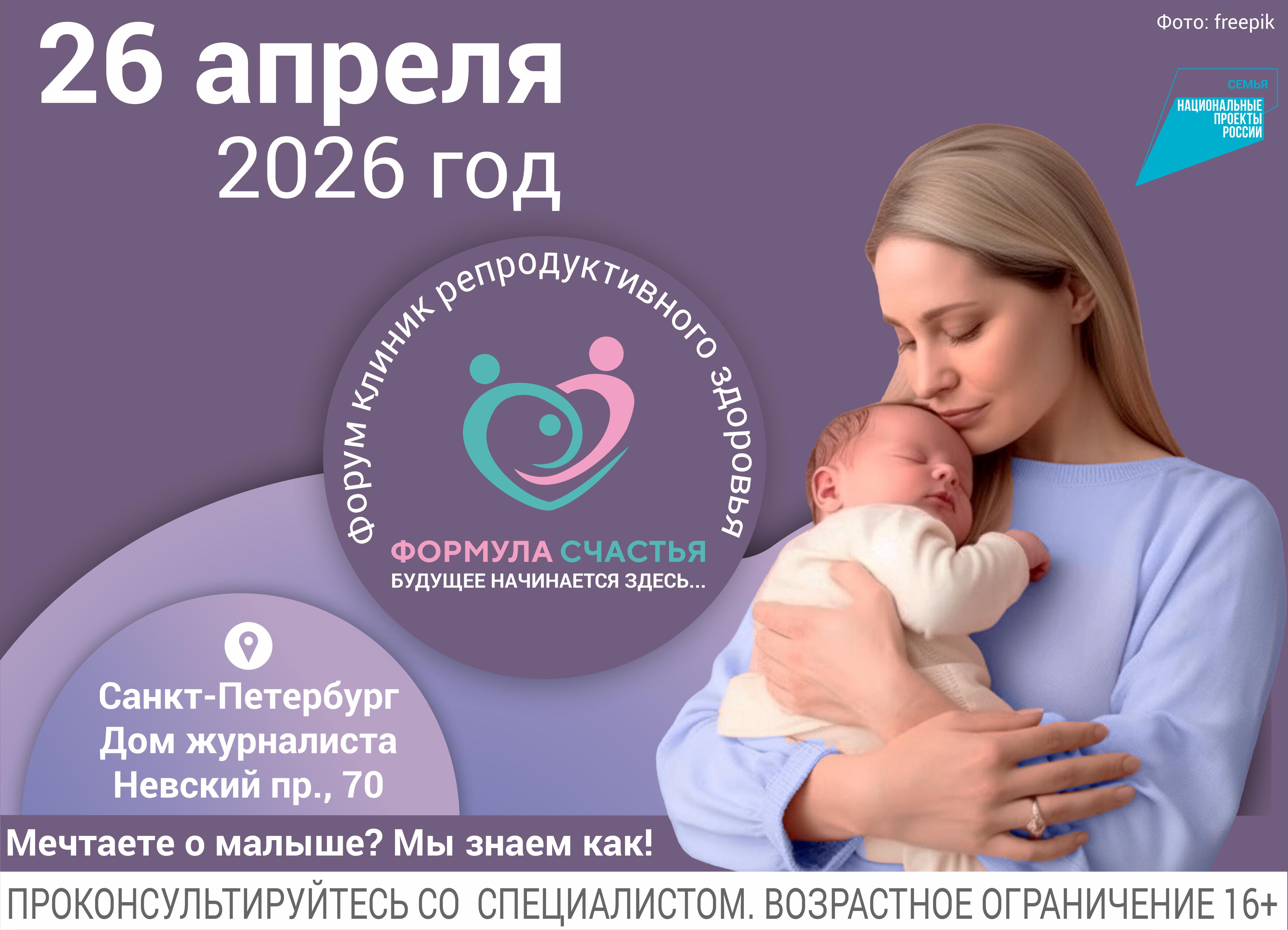 В Петербурге на площадке Дома журналиста 26 апреля в 10:30 состоится масштабный форум «Формула счастья. Будущее начинается здесь», посвящённый вопросам женского и мужского репродуктивного здоровья, планирования и ведения беременности, а также применению ВРТ, включая ЭКО.