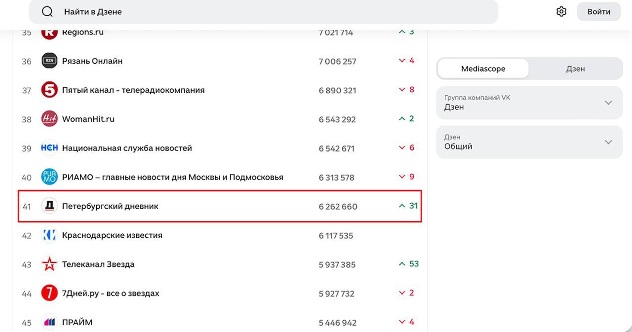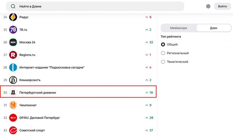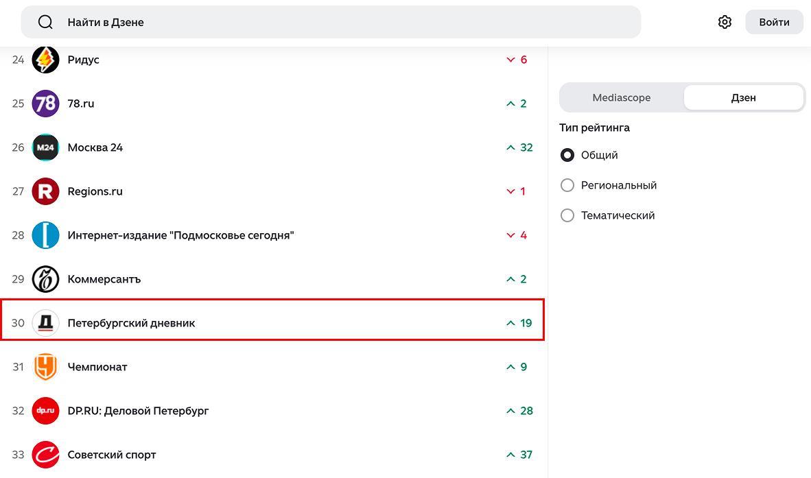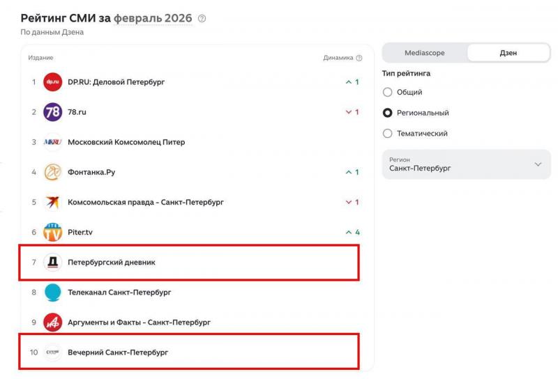 В региональном рейтинге СМИ Петербурга «Петербургский дневник» сохранил седьмое место. Кроме того, в список вошел дзен-канал издания «Вечерний Санкт-Петербург».